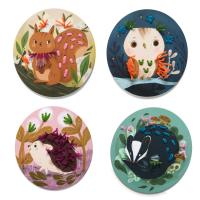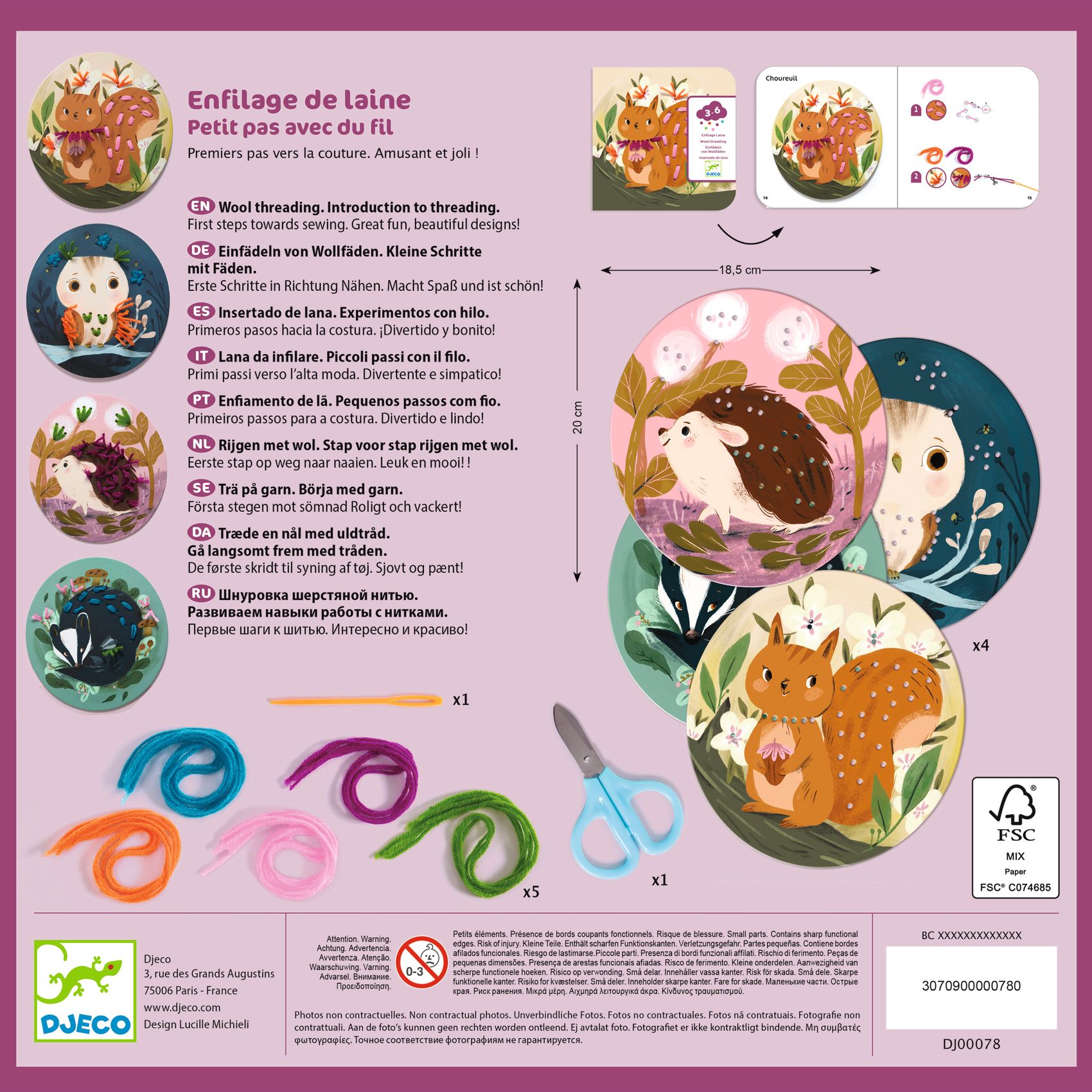 4 dicke, illustrierte und durchlöcherte Pappkreise. 20 Stück Wollfäden mit einer Länge von 50 cm. 5 Farben. 1 Nadel. 1 Schere. 1 Büchlein.