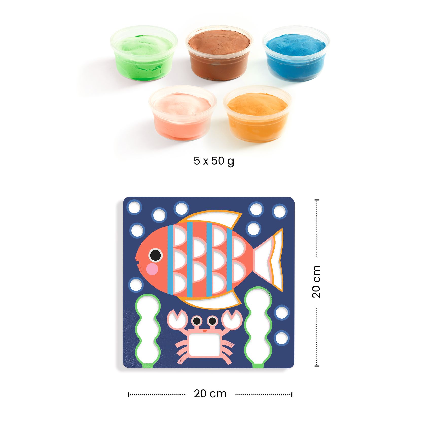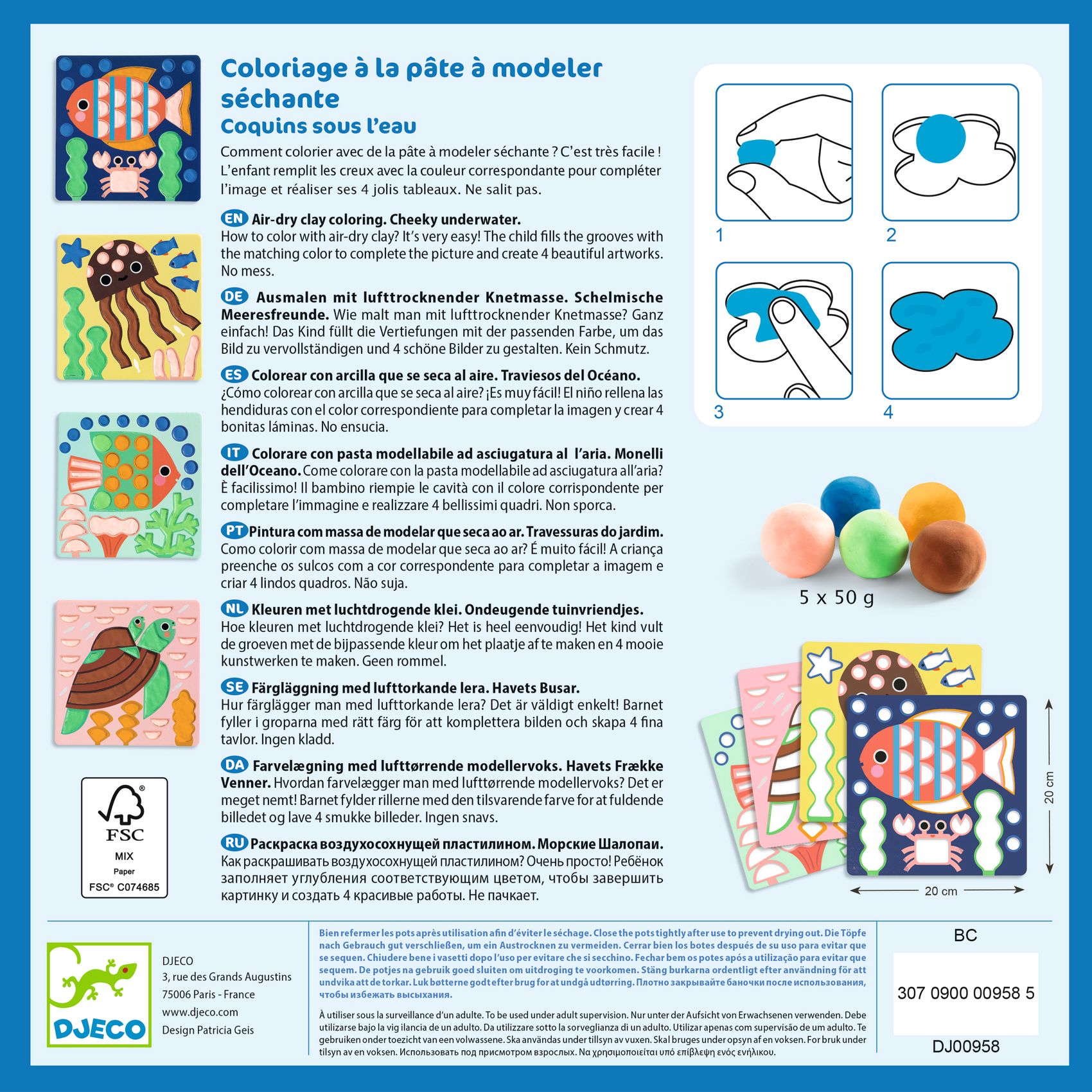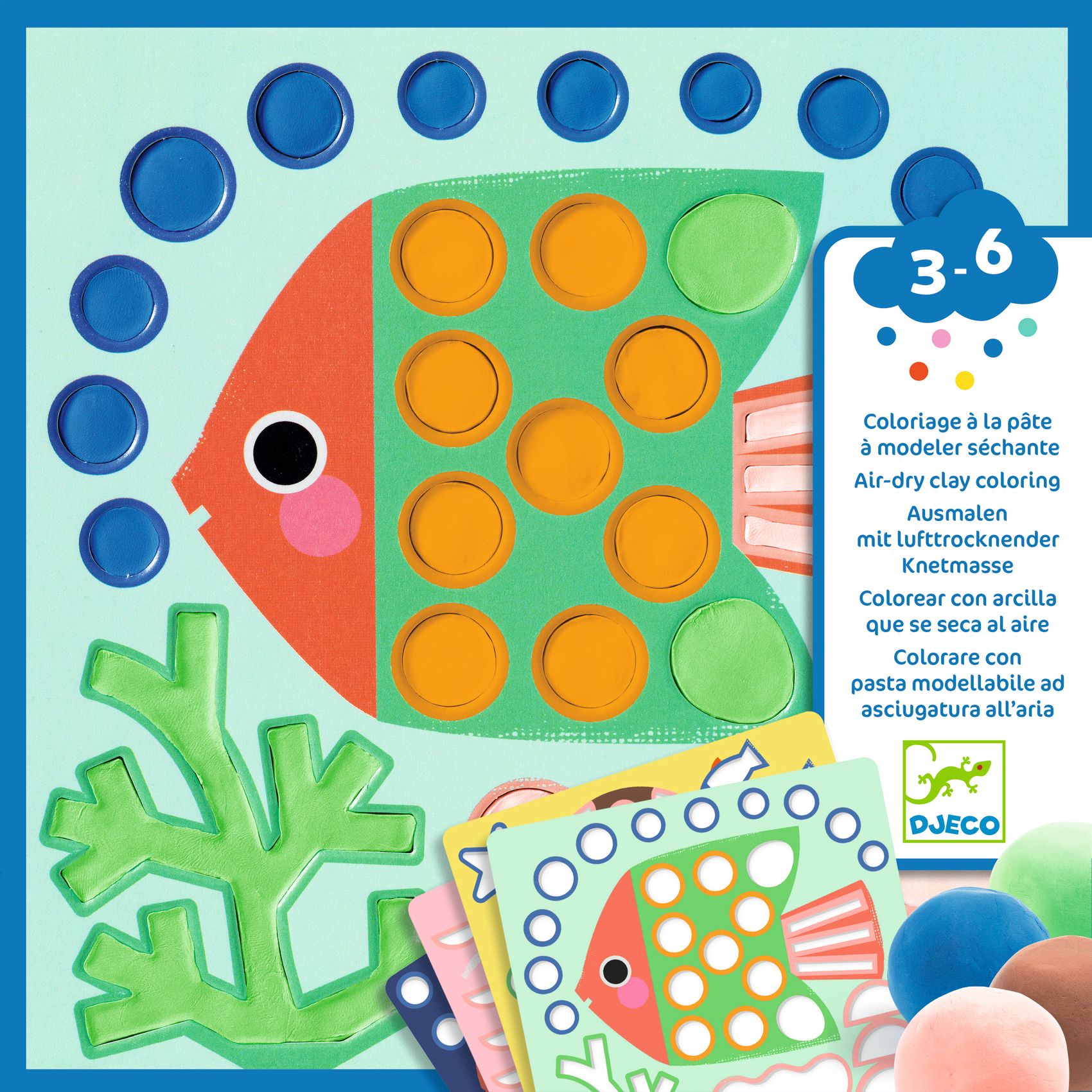 Dank der 4 Brettchen mit Vertiefungen und der 5 Töpfchen mit lufttrocknender Modelliermasse kann das Kind einfach die entsprechenden Bereiche füllen und so für hübsche reliefartige Illustrationen sorgen. Diese schnell vorzubereitende sensorische Aktivität fördert die Feinmotorik und die Farbwahrnehmung, sie ist sauber in der Anwendung und wird von einer gut verständlichen Anleitung begleitet. Kneten und Kreieren mit großem Spaß und ohne Flecken.