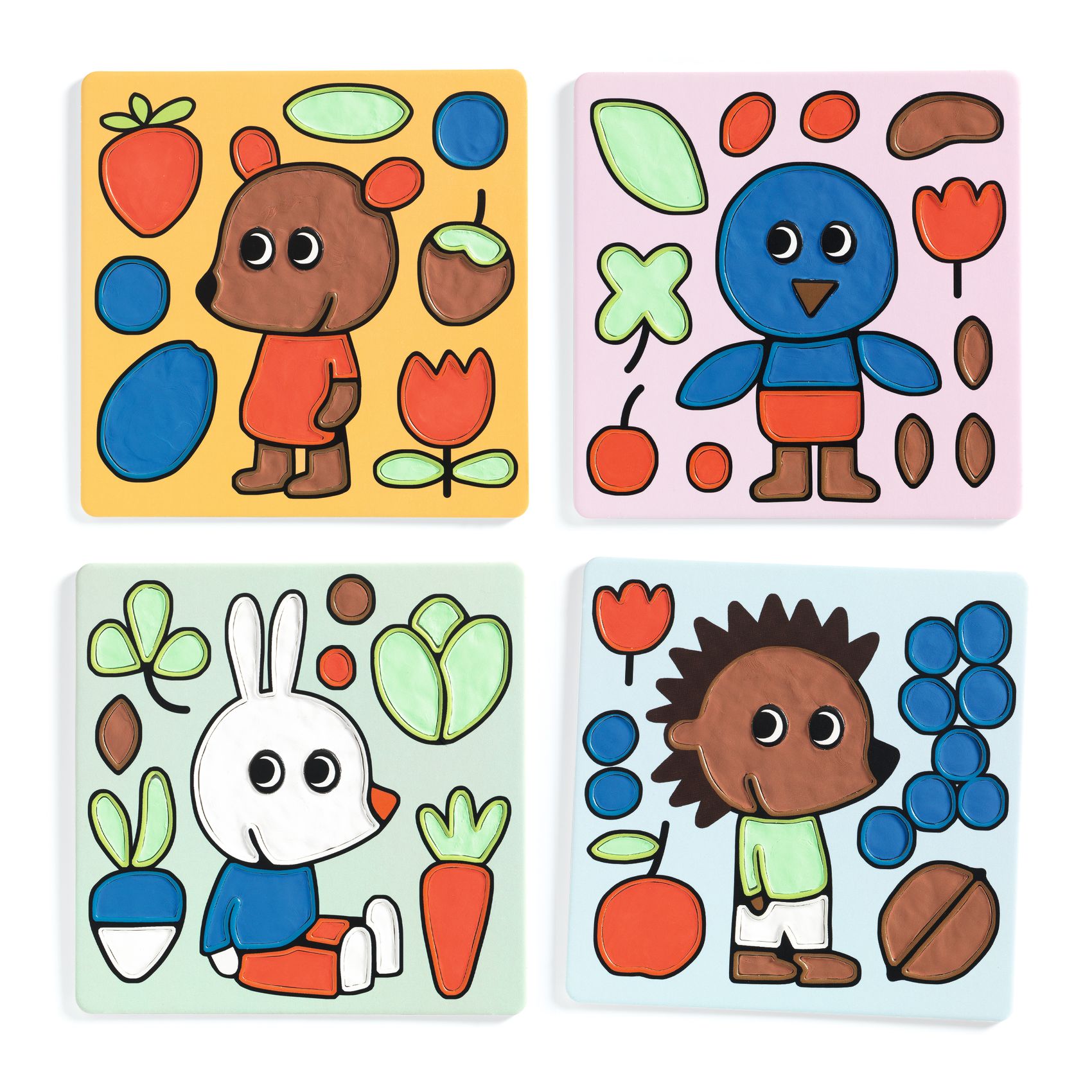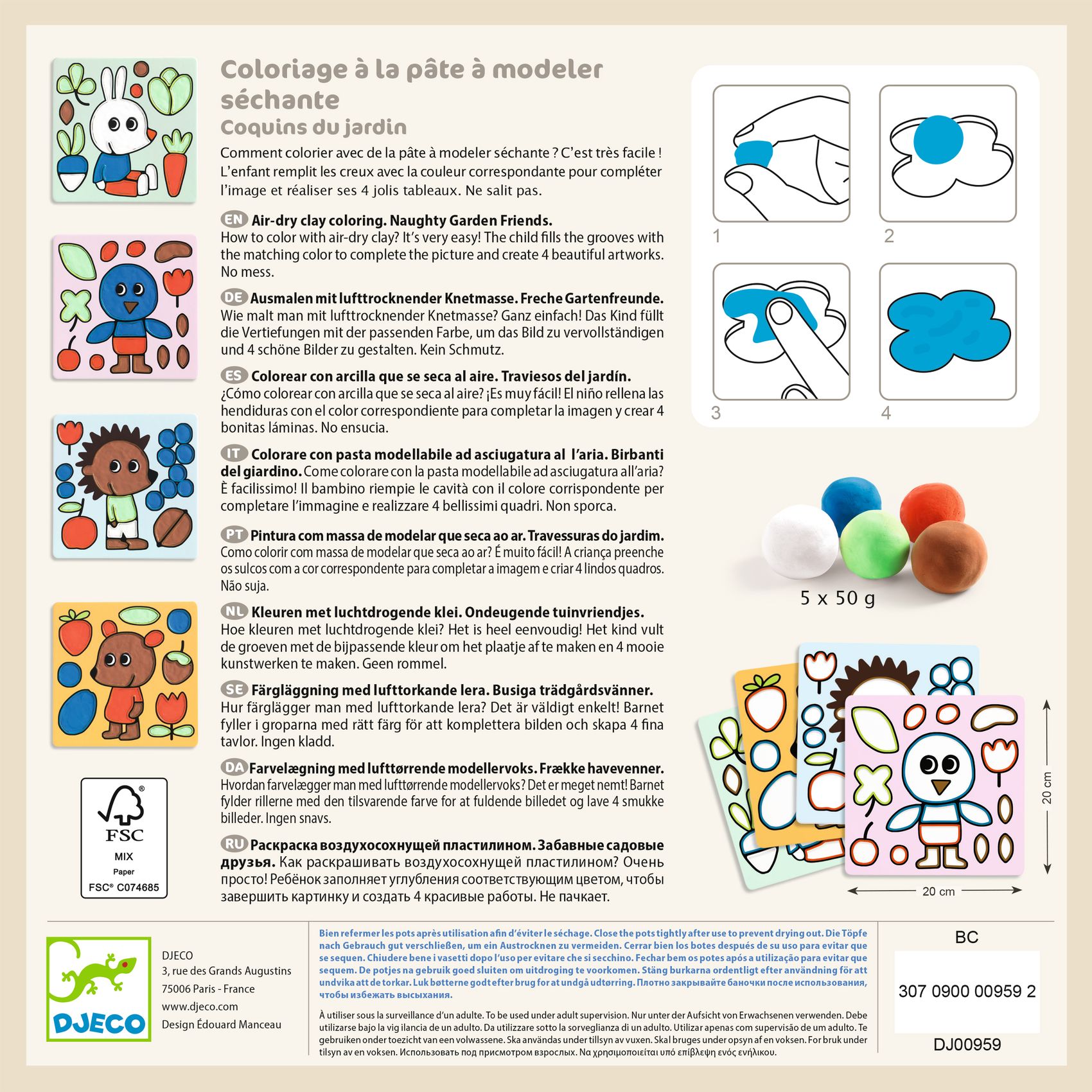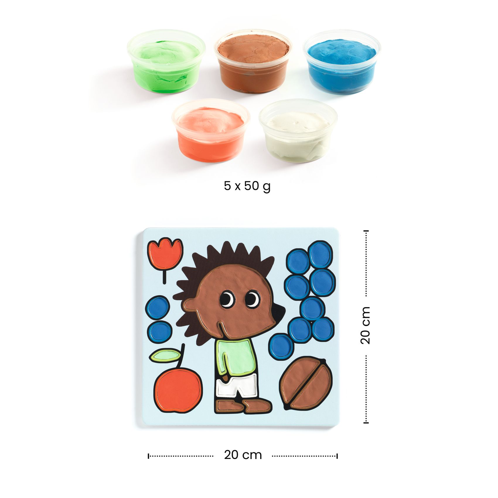 Dank der 4 Brettchen mit Vertiefungen und der 5 Töpfchen mit lufttrocknender Modelliermasse kann das Kind einfach die entsprechenden Bereiche füllen und so für hübsche reliefartige Illustrationen sorgen. Diese schnell vorzubereitende sensorische Aktivität fördert die Feinmotorik und die Farbwahrnehmung, sie ist sauber in der Anwendung und wird von einer gut verständlichen Anleitung begleitet. Kneten und Kreieren mit großem Spaß und ohne Flecken.