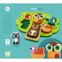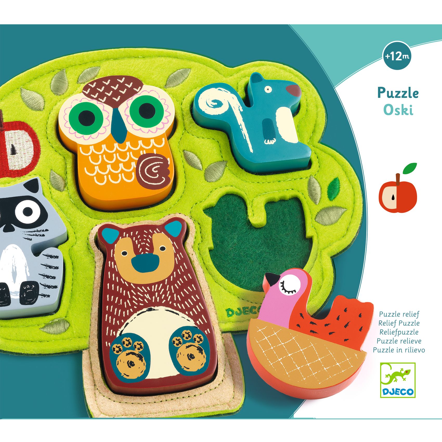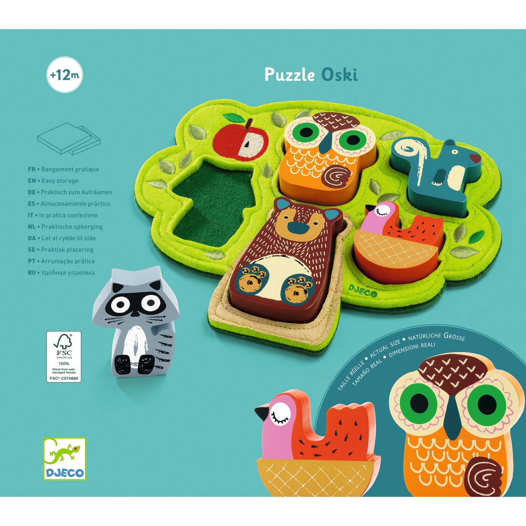 Oski ist ein Puzzle zum Thema Wald. Eine hübsche baumförmige Unterlage aus besticktem und bedrucktem Filz und 5 Holztiere zum Einsetzen.