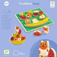 Puzz & Boom ist ein einfach zu bildendes Holzpuzzle und zugleich ein Gleichgewichtsspiel. Das Obst und die Katze im Relief stehen und können aufeinandergestapelt werden, um auf dem ?Bananen?-Sockel eine Pyramide zu bilden.