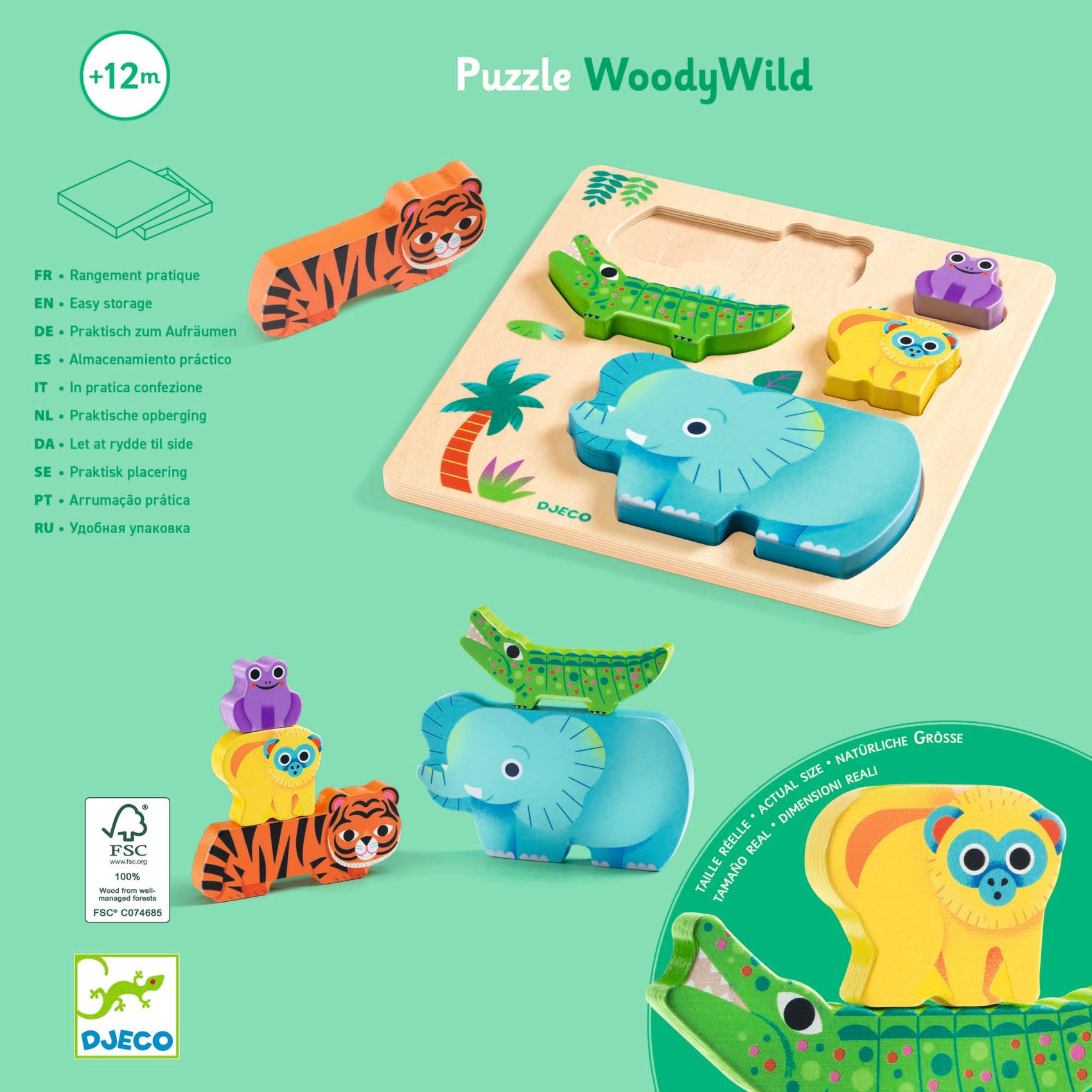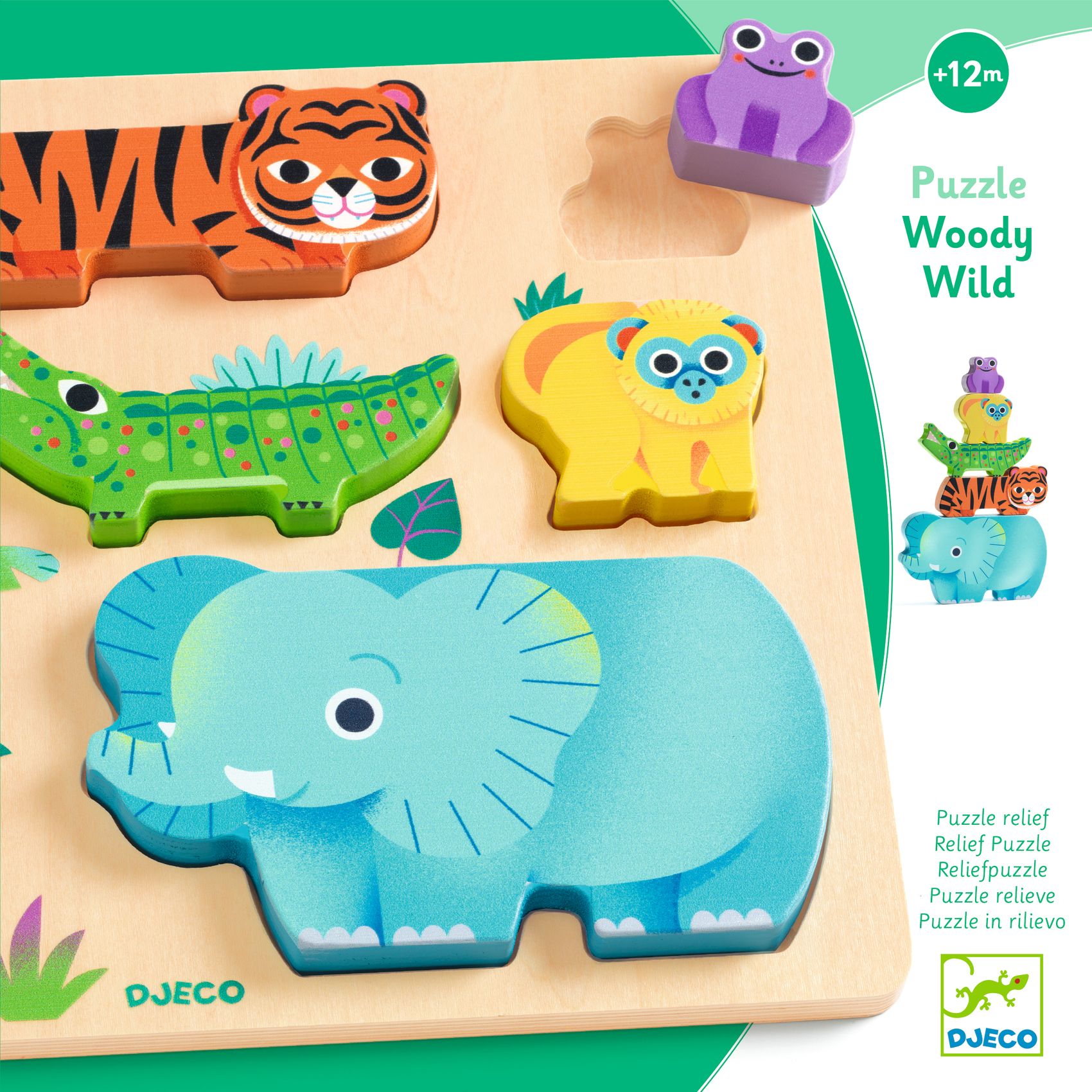 WoodyWild ist ein Puzzle aus Holz zum Thema Wildtiere, das sich einfach zusammensetzen lässt. Die dicken Teile mit Reliefstruktur ermöglichen dem Kind, auch außerhalb des Puzzles mit den Tieren zu spielen.