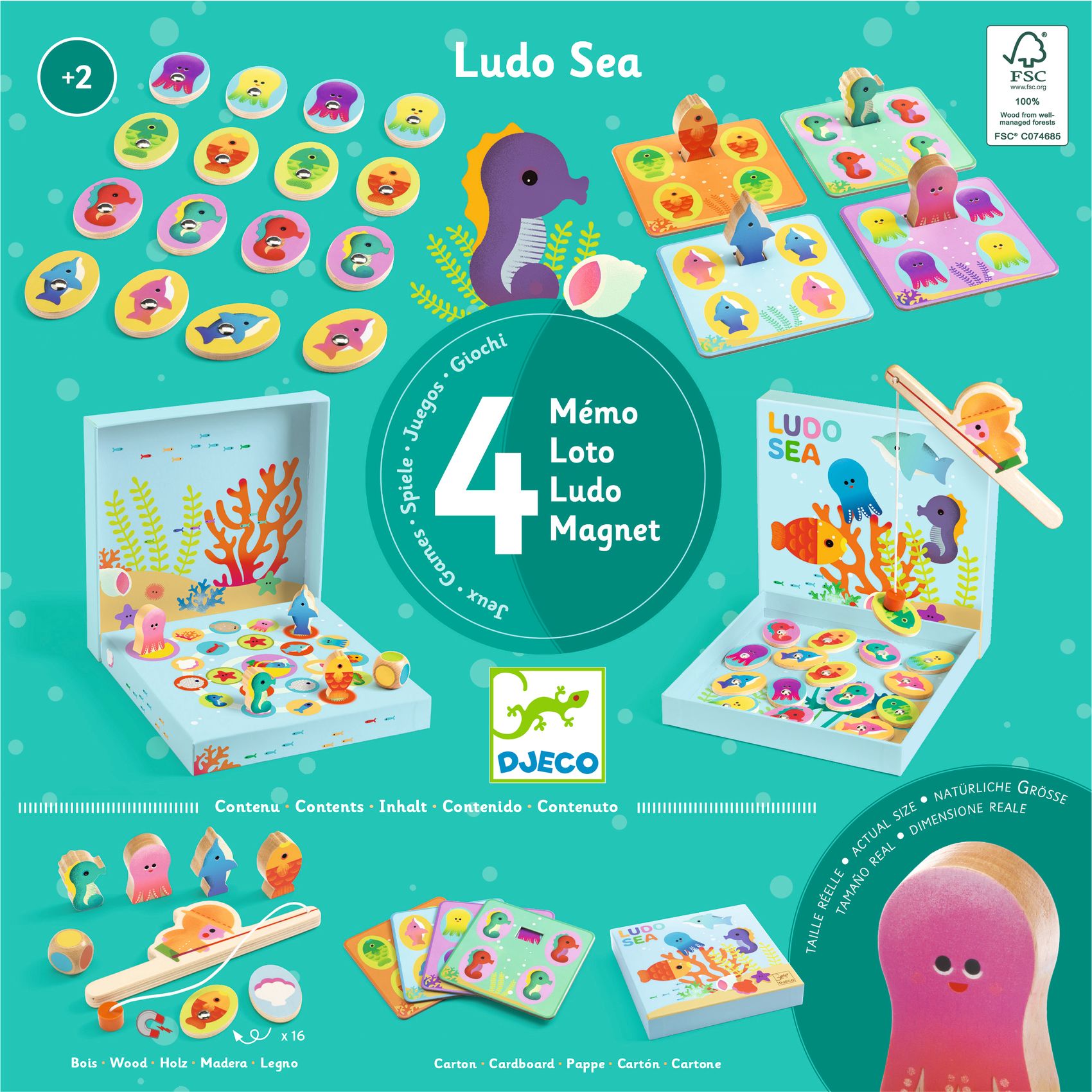 Eine schöne Box mit vier Spielen: Magnet-Angelspiel, Lotto, Memory und ein Wettlaufspiel. LudoSea ist die ideale Box, um vier Spieleklassiker zu entdecken, die Djeco für Kinder ab 2 Jahren neu überarbeitet hat.