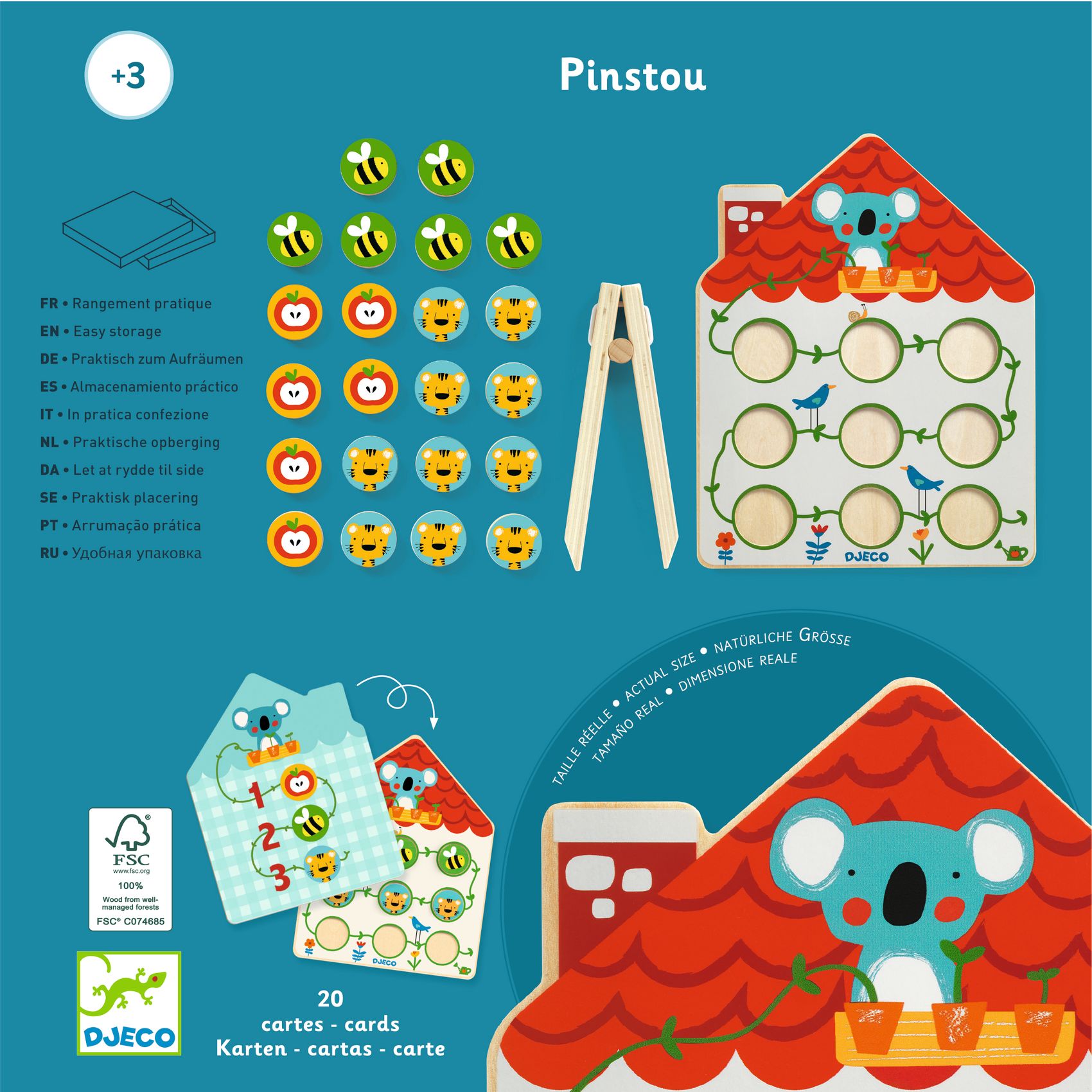 Pinstou ist ein Zähl- und Koordinationsspiel. Der Koala gibt die Anweisungen und das Kind legt mit der Pinzette die richtige Anzahl von Elementen auf das Brett. Auf der Rückseite der Karten befindet sich die Lösung in Bildern!