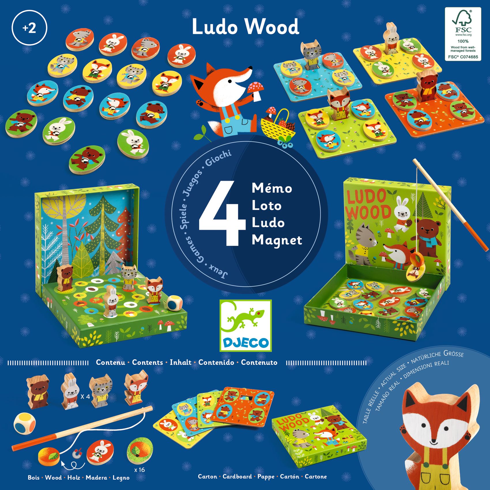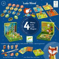 Eine schöne Box mit vier Spielen: ein Magnet-Angelspiel, ein Lotto, ein Memo und ein Wettlaufspiel. LudoWood ist die ideale Box, um vier klassische Spiele zu entdecken, die Djeco für Kinder ab 2 Jahren neu überarbeitet hat.