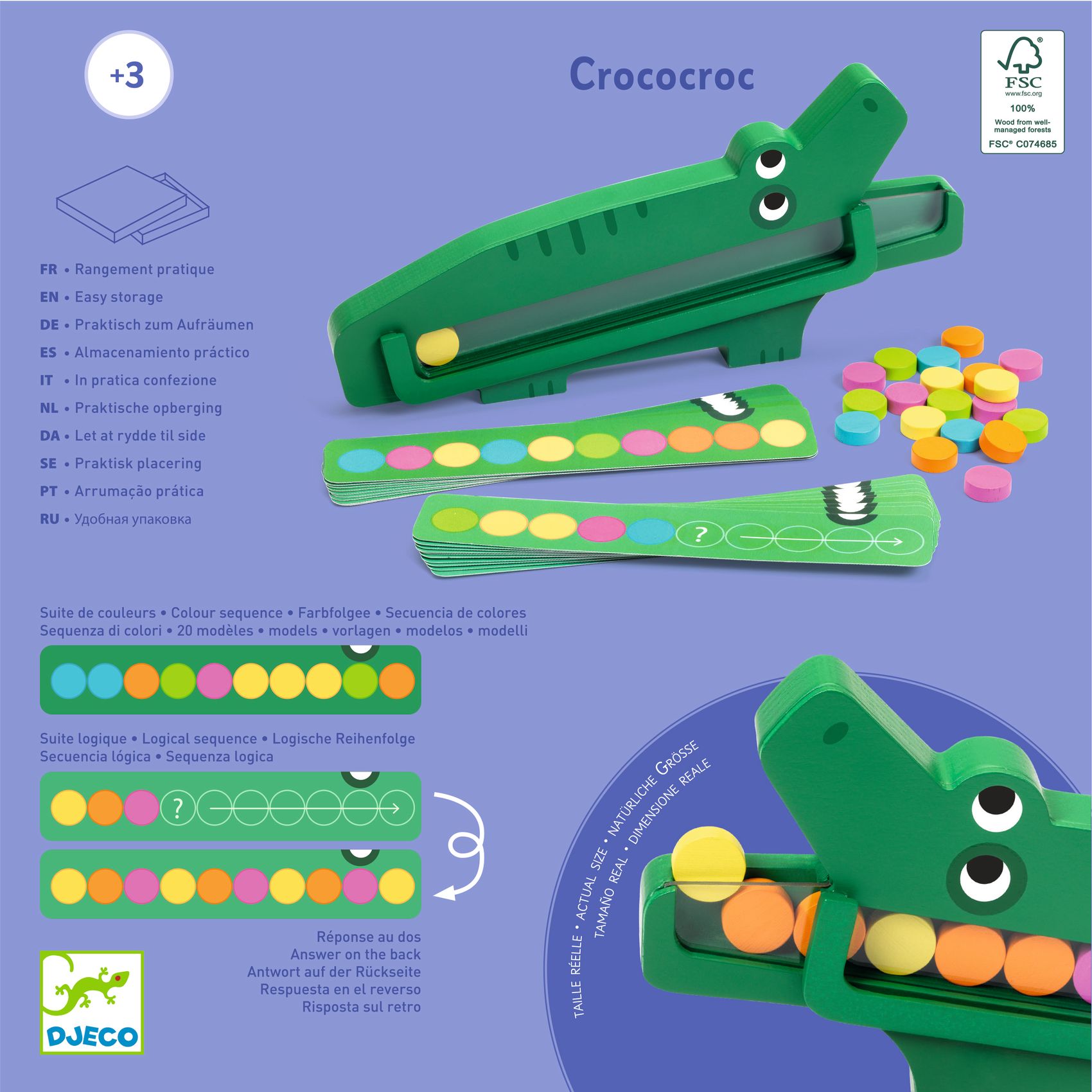 1 Holzkrokodil, 20 farbige Holzteile und 20 Karten.