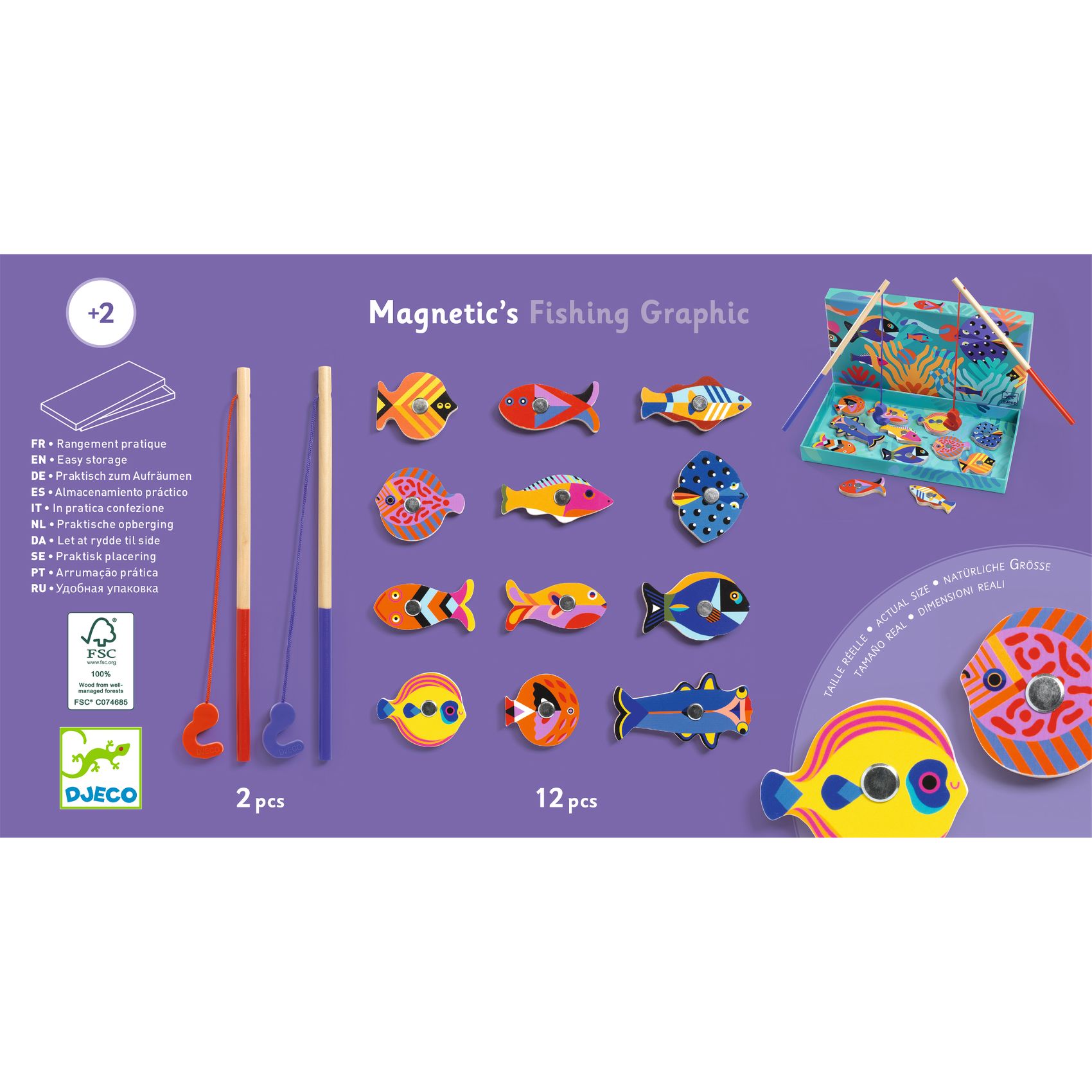 Bereit für einen Angelausflug? Fische aus Holz, zwei Angelruten und eine hübsche Schachtel, die den Meeresboden darstellt. Das Kind fängt die magnetischen Holzteile mit der Angel. Der Angelausflug kann beginnen! Für kleine Fischer ab 2 Jahren.