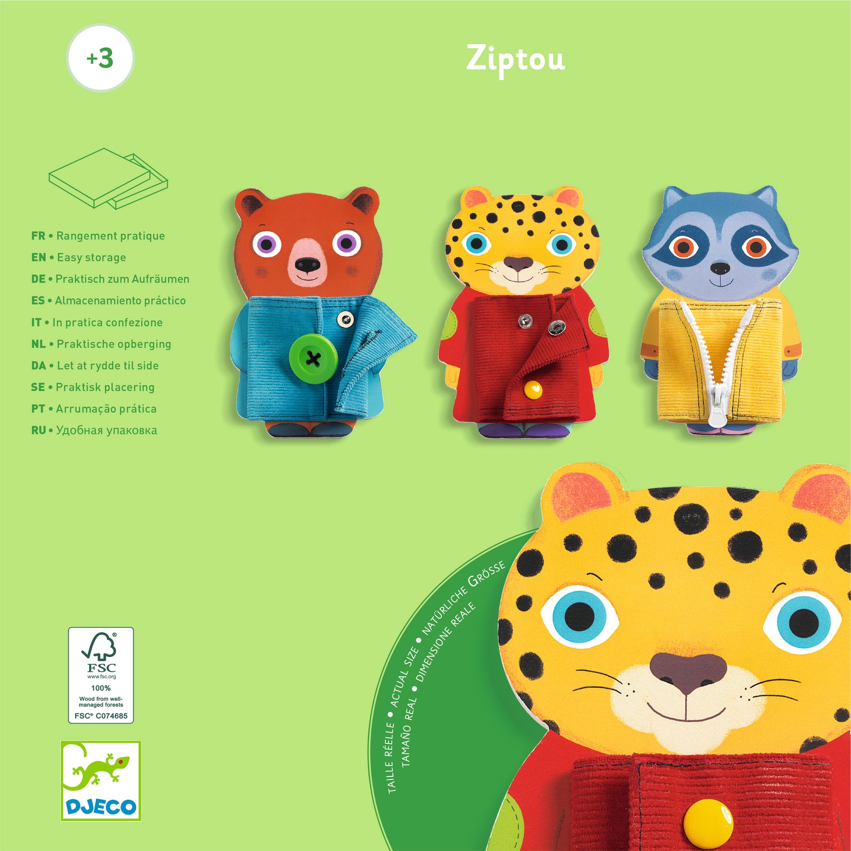 Ein Koordinationsspiel mit drei niedlichen Holztierchen. Das Kind übt an jeder Figur, die verschiedenen Verschlüsse ihrer Kleidungsstücke zu öffnen und zu schließen. Ziptou unterstützt Kinder ab 3 Jahren bei ihren ersten Lernerfahrungen.