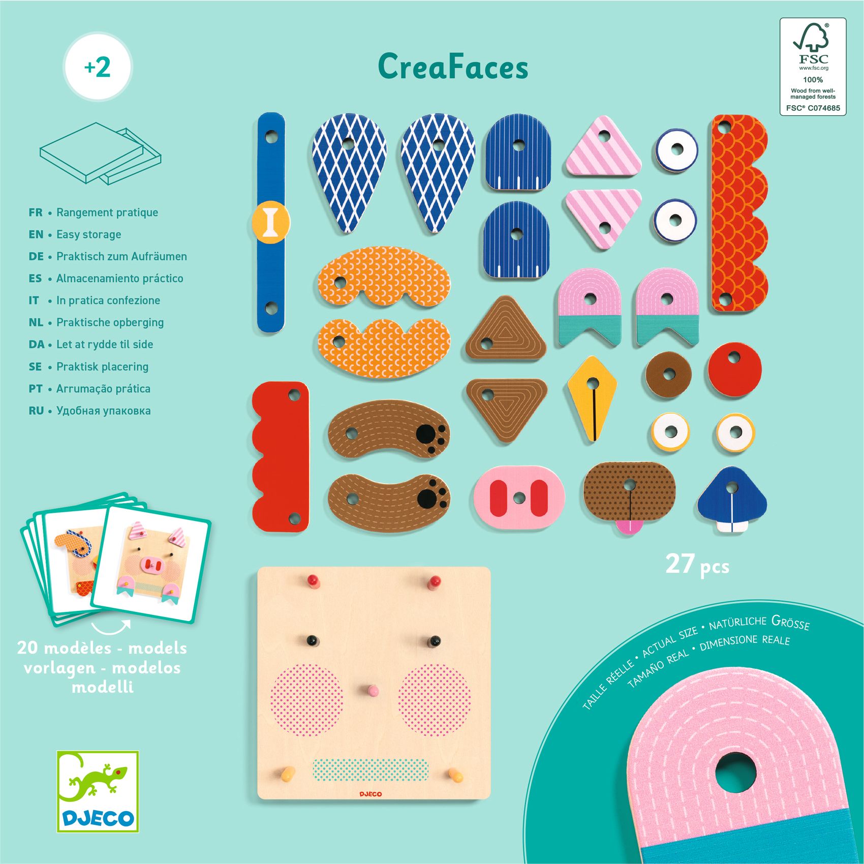 CreaFaces ist ein Lege- und Koordinationsspiel für Kinder ab 2 Jahren. Das Kind legt mit Hilfe der Vorlagekarten Tiere nach, indem es die Holzteile auf der Unterlage anordnet. Die Kinder können die verschiedenen Elemente von Kaninchen, Hund, Schwein und Huhn so stecken, dass immer wieder neue, witzige Tiergesichter entstehen!