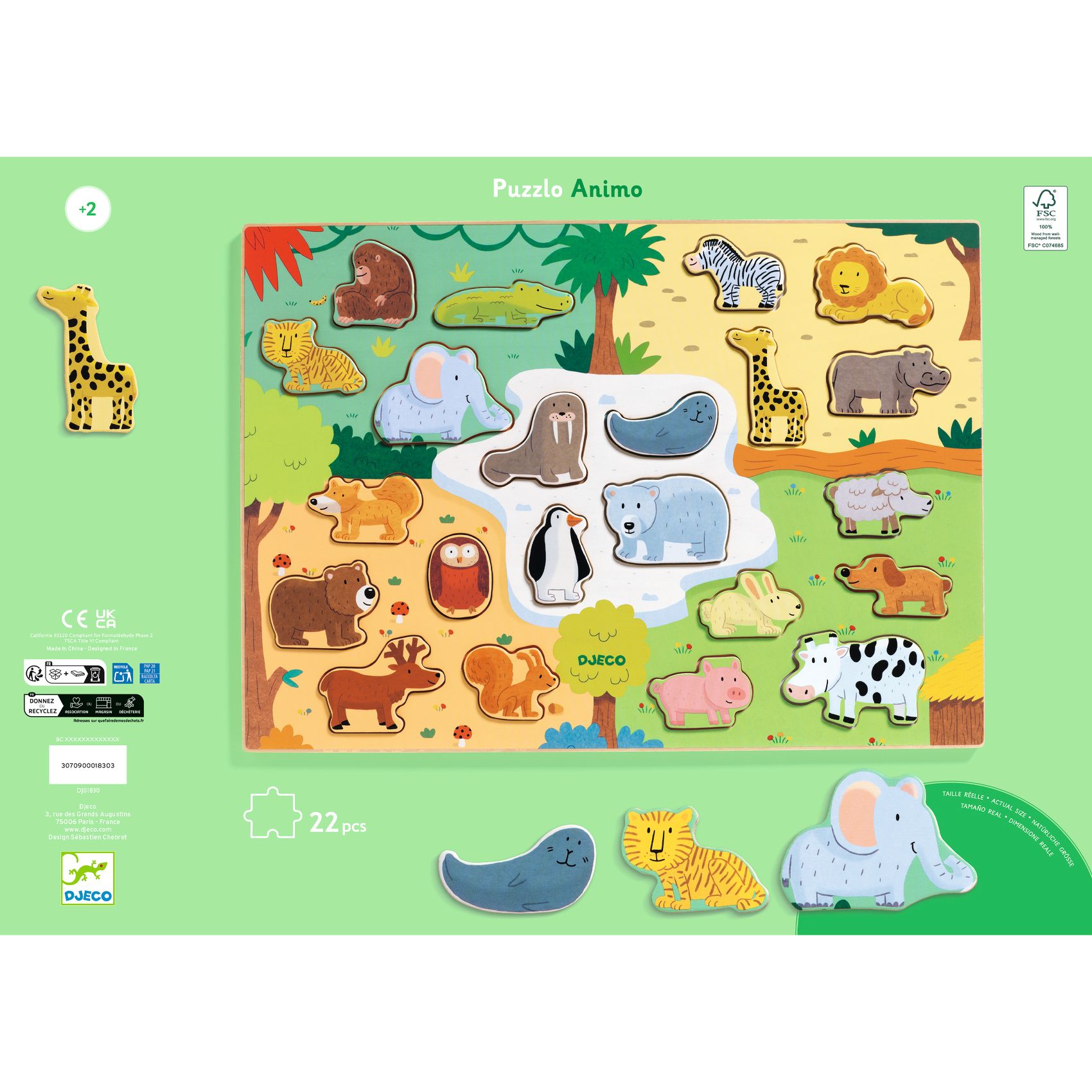 Ein Holzpuzzle zum Thema Tiere. Das Kind platziert die 22 Tiere durch Erkennen der Abdrücke der Tiere und der Mitte auf dem Holzbrett.