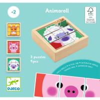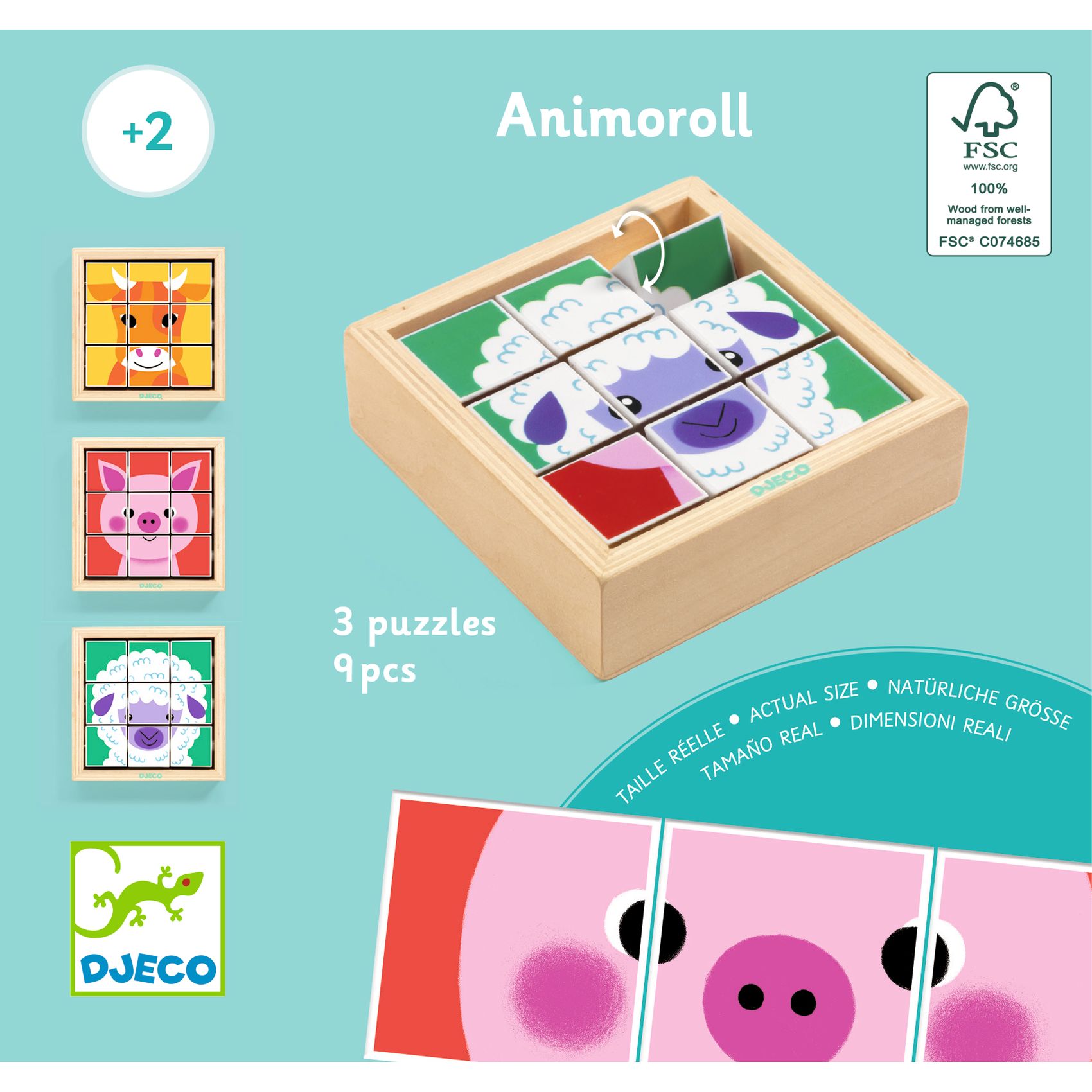 Tournanimo ist ein witziges Puzzle in einem Holzrahmen! Wenn das Spiel flach liegt kann das Kind die sich drehenden Teile drehen und eines der 3 Tiere erstellen: Schaf, Kuh, Schwein.