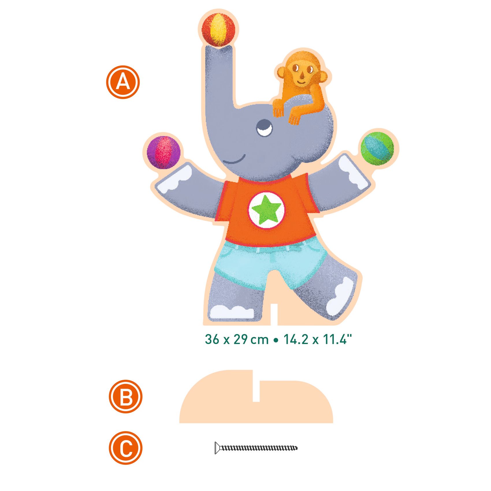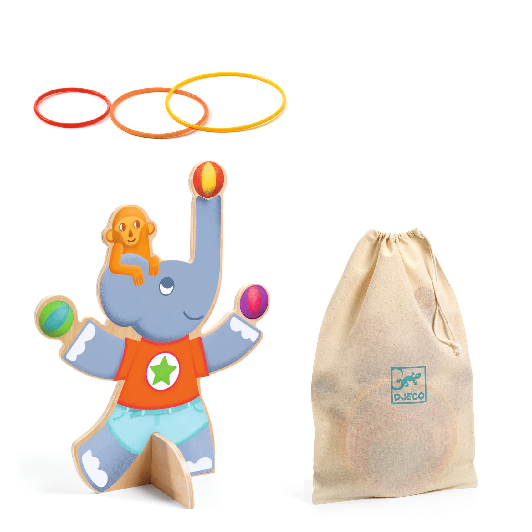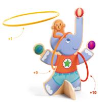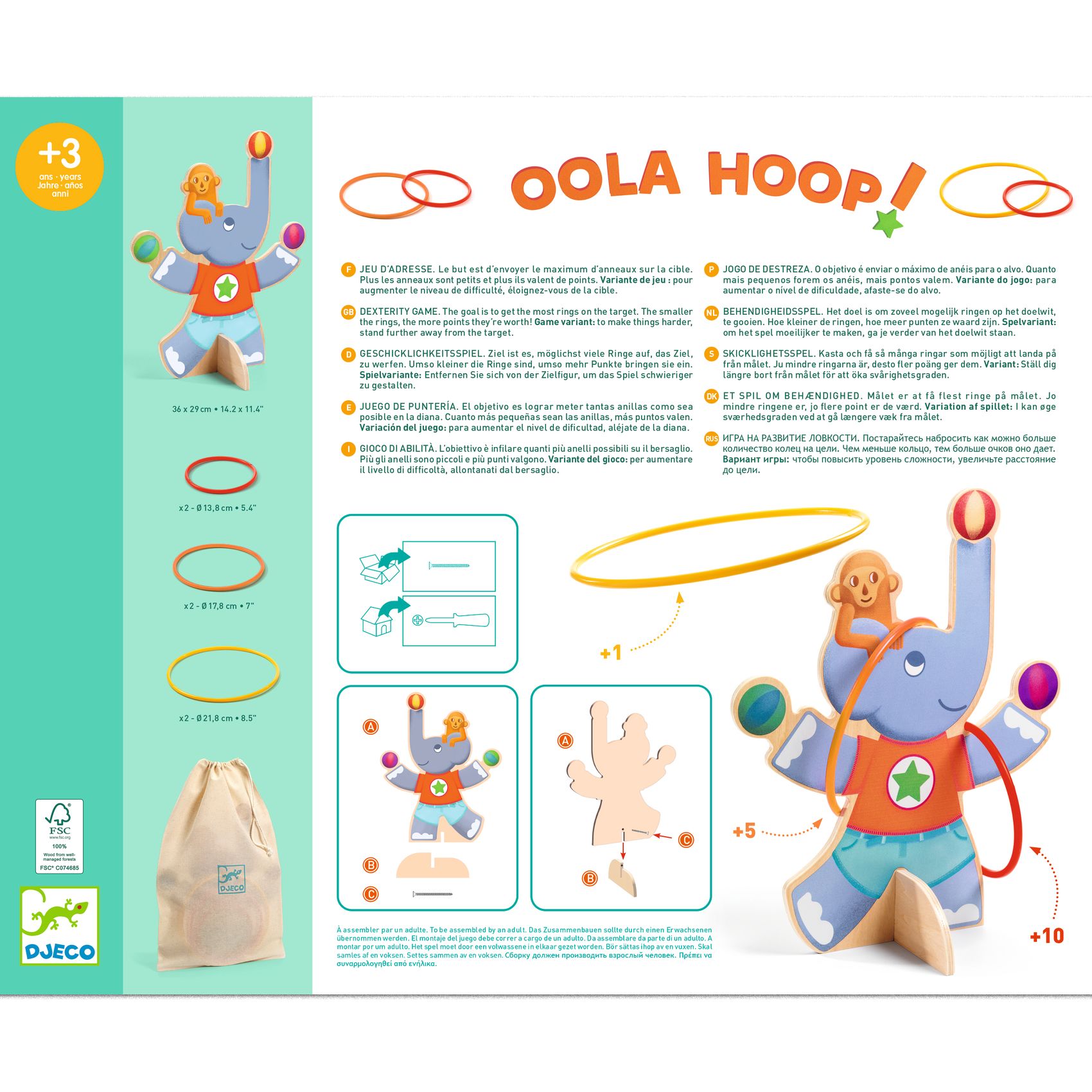 Oola Hoop ist ein Ringwurfspiel: Wer trifft mit den Ringen den Elefanten und erreicht die meisten Punkte? Die Punktanzahl hängt von der Größe der Ringe ab: Je kleiner die Ringe sind, desto schwieriger wird es, sie auf der Figur zu platzieren. Spielvariante: Je größer die Entfernung des festgelegten Wurfbereichs desto höher der Schwierigkeitsgrad. Ein großer Klassiker unter den Geschicklichkeitsspielen für Kinder!