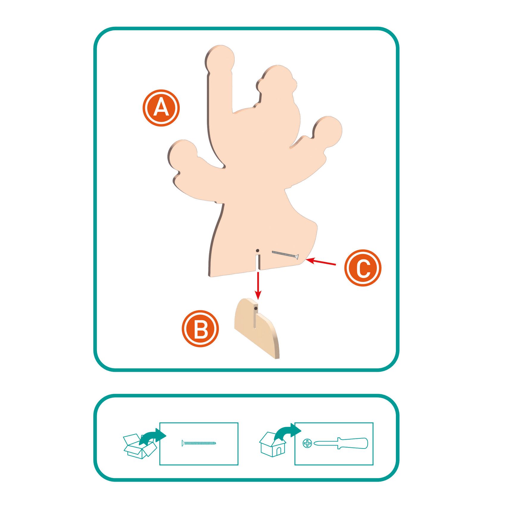 1 Zielfigur aus Holz (Größe 36 cm), 6 farbige Kunststoffringe (2 x 21 cm / 2 x 17 cm / 2 x 13 cm), 1 Aufbewahrungsbeutel aus Baumwolle