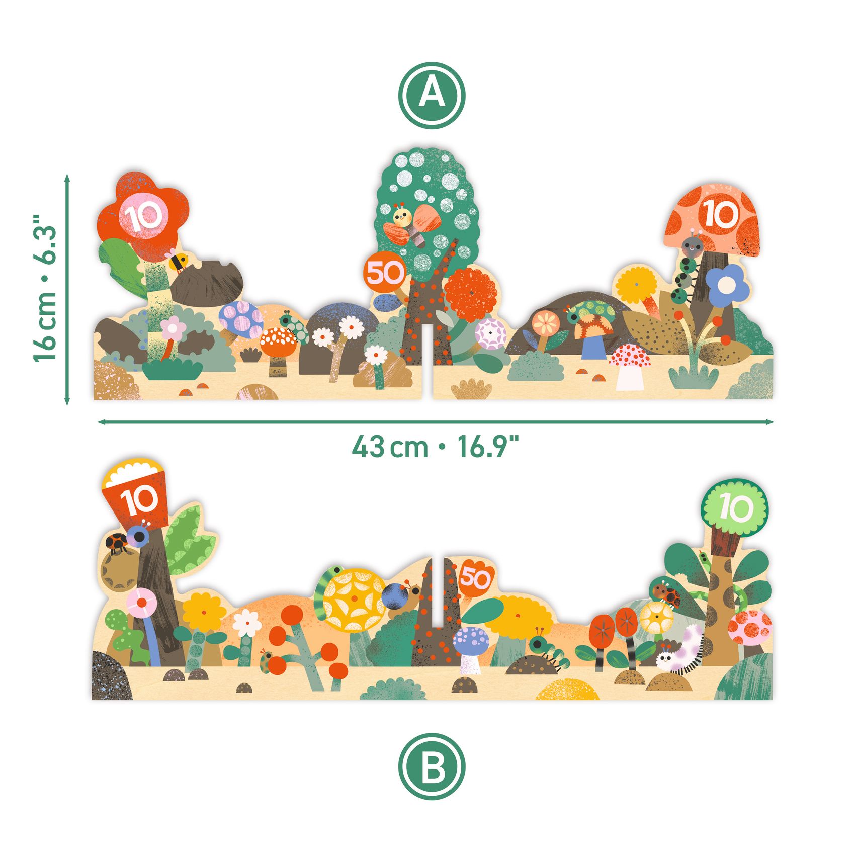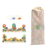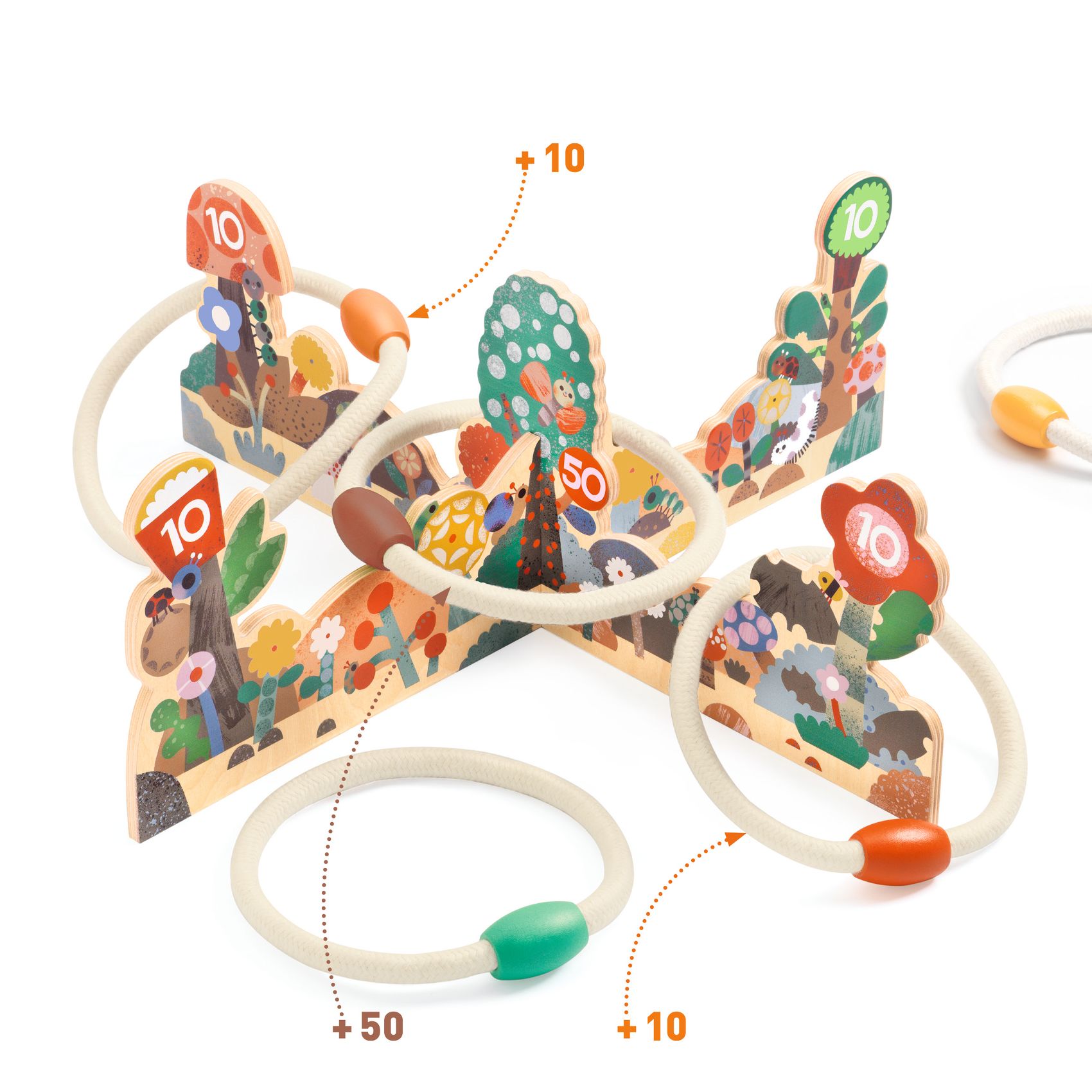 1 Ziel aus 2 illustrierten, zusammensteckbaren Brettern, 5 Ringe aus Seil und bemaltem Holz, 1 Beutel aus Baumwolle.