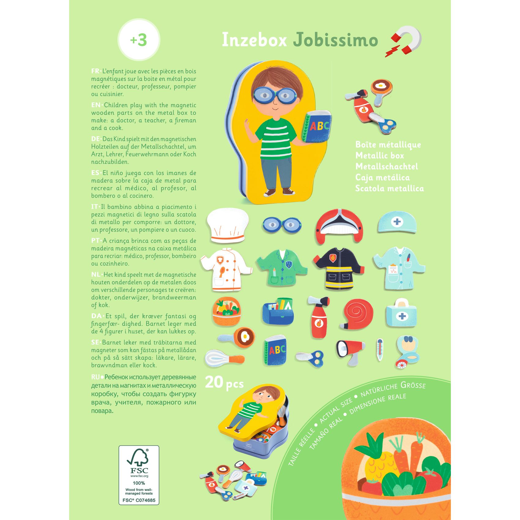 Inzebox, eine neue Art von Magnetspiel! Eine Silhouetten-Metallbox, auf der das Kind magnetische Holzteile zusammensetzt. Jobissimo, ein Spiel, bei dem das Kind eine Feuerwehrfrau, einen Arzt, eine Lehrerin, einen Koch und andere Figuren kreiert. Das macht Spaß! Das Kind kann sowohl das Mädchen als auch den Jungen anziehen, indem es auf beiden Seiten der Box spielt.