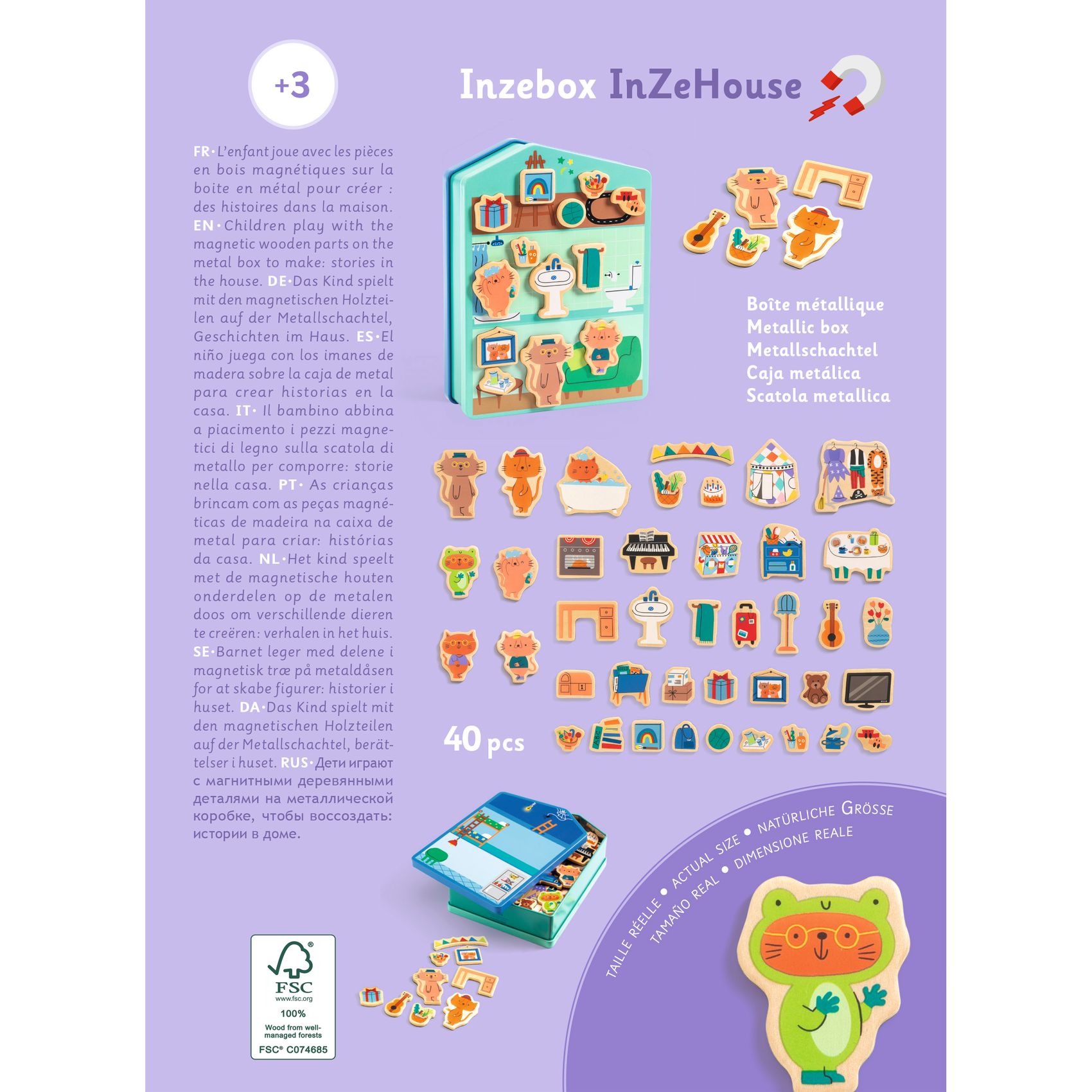 Bei Inzebox spielt das Kind mit Holzmagneten auf einer Metallbox in Form eines Hauses und dekoriert die 6 Zimmer (Dachboden, Schlafzimmer, Küche, Wohnzimmer, Badezimmer und Spielzimmer)!