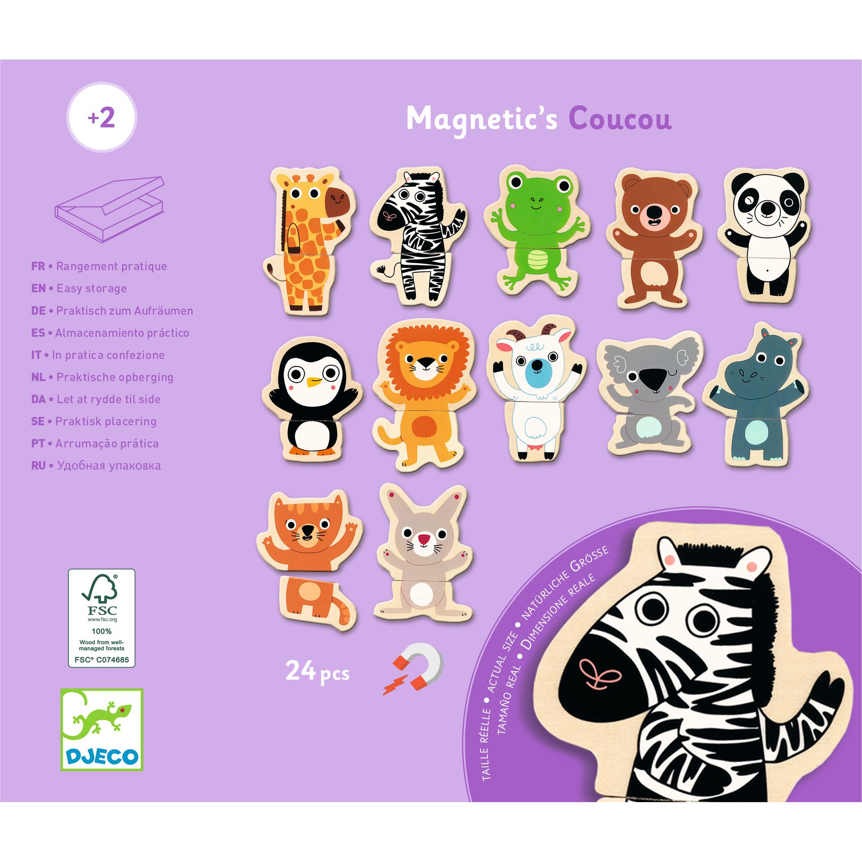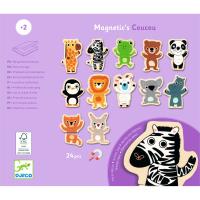 Eine Box mit 24 magnetischen Holzteilen, um Tiere zusammenzusetzen oder sich noch andere lustige Wesen auszudenken. Das Kind hilft der Giraffe, ihre Beine, und dem Löwen, seinen Kopf wiederzufinden!