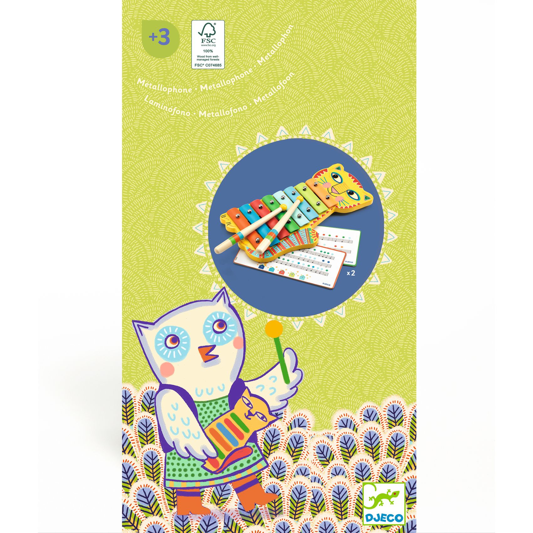 Ein wunderschön illustriertes Metallophon in Form einer Katze für Kinder. Das Kind spielt die Noten mit den Holzstäbchen. Zur Orientierung sind zwei Partituren enthalten, die die Farbcodes der Tasten verwenden. Das ideale Geschenk für kleine Musiker ab 3 Jahren.