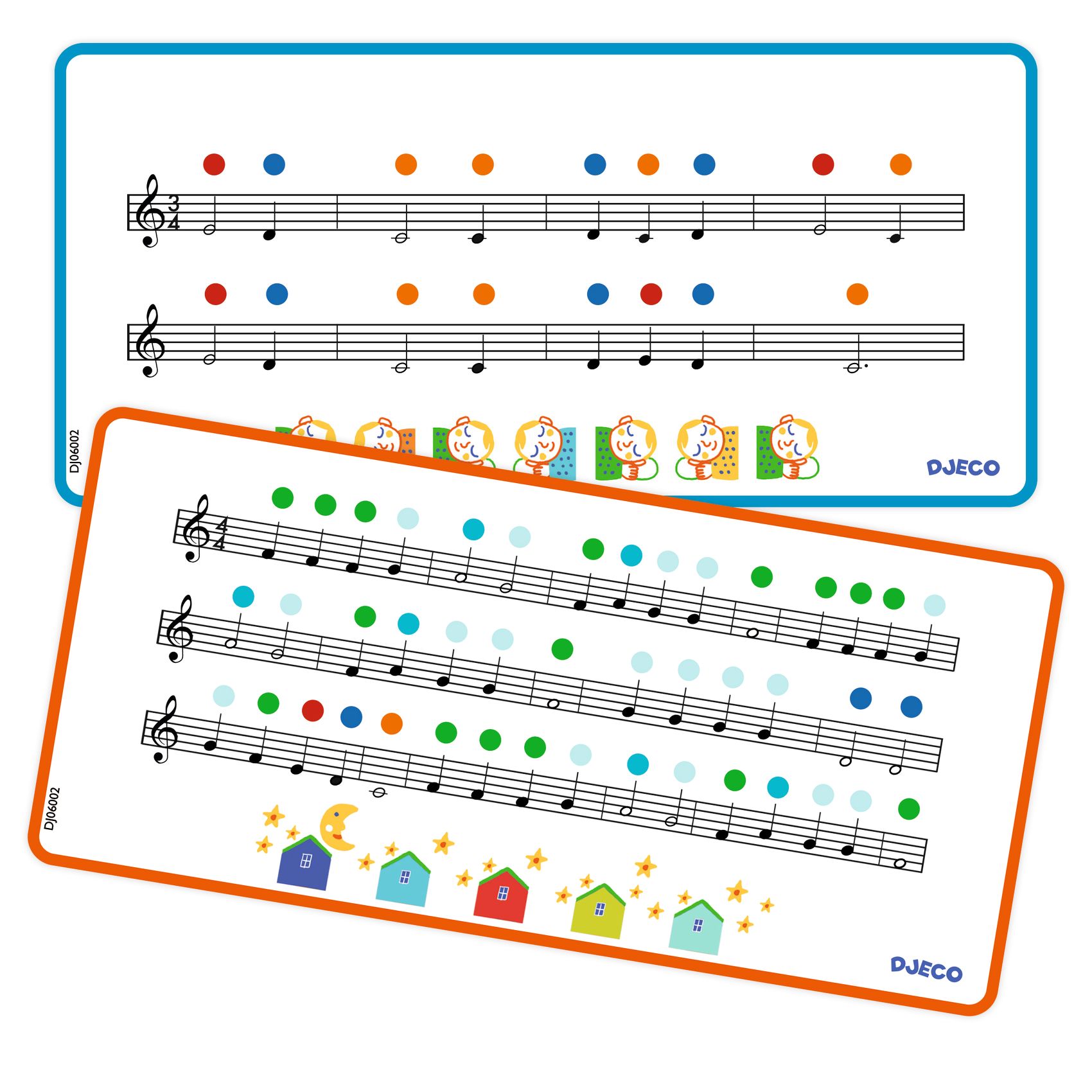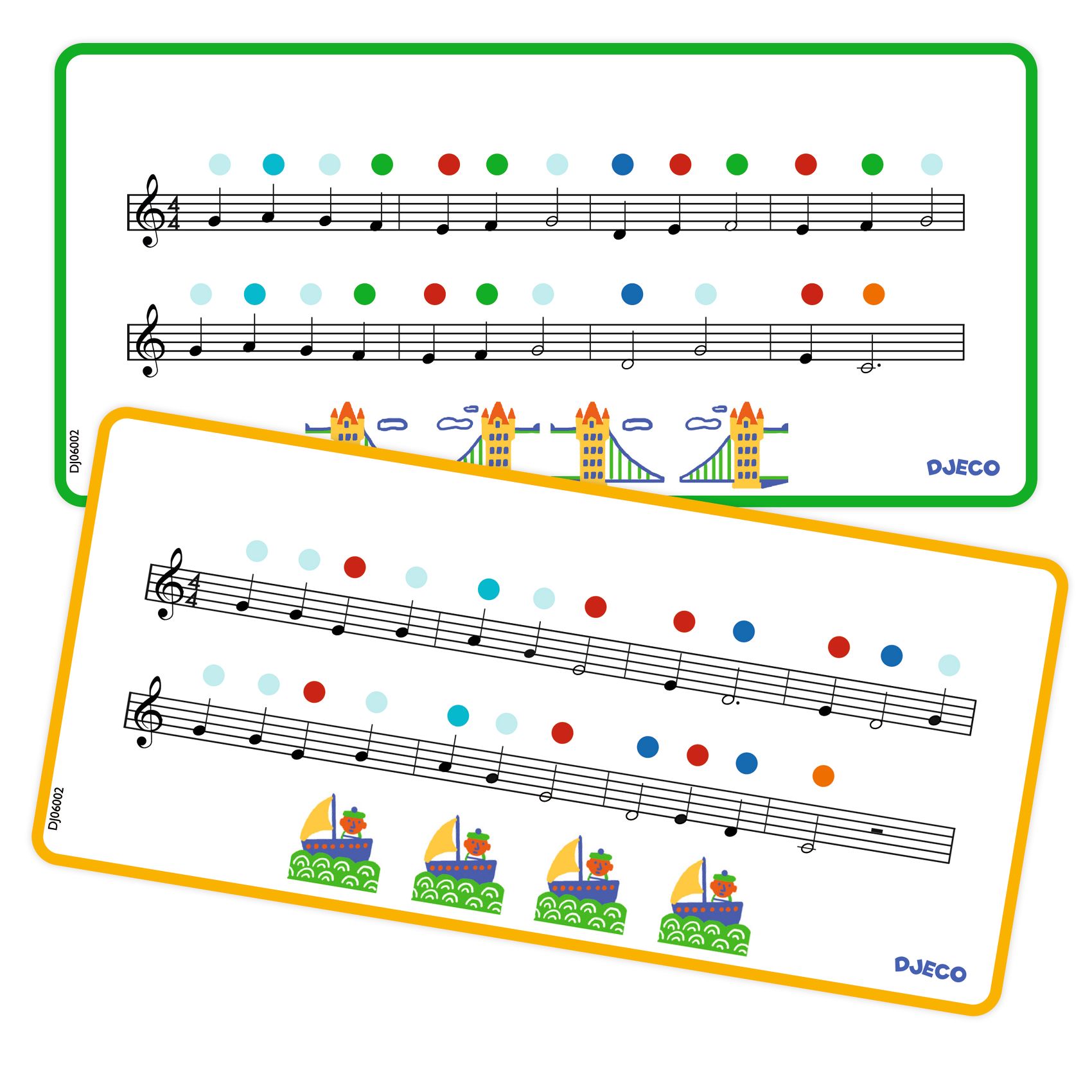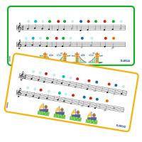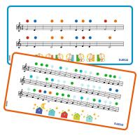 2 doppelseitige Notenvorlagen mit 4 Melodien und farbigen Hilfspunkten.