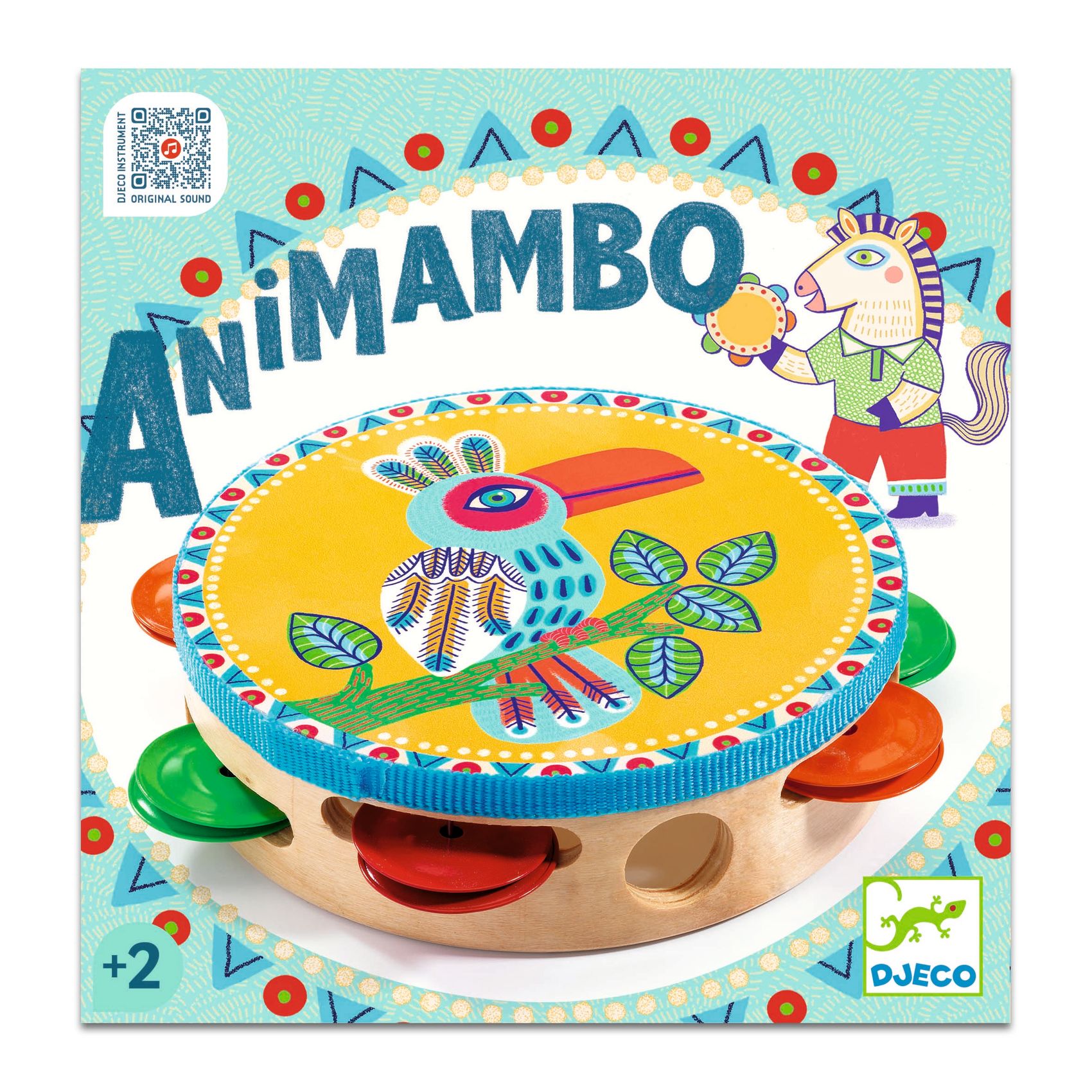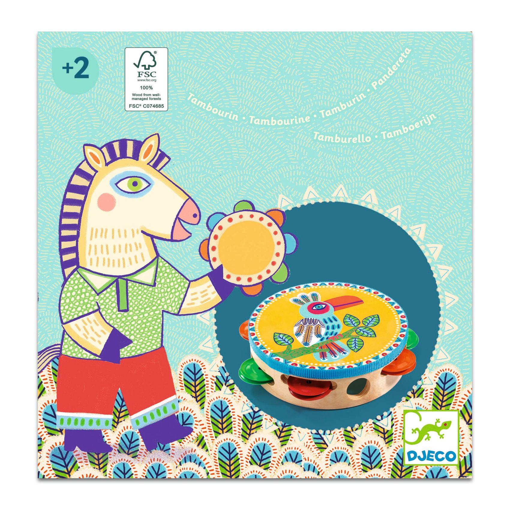 Ein schönes Tamburin aus Holz und Metall, auf dem ein lustiger, auf einem Ast sitzender Tukan abgebildet ist. Das Kind schlägt das Tamburin mit der Handfläche, um die Schellen zum Klingen zu bringen. Das ideale Geschenk für kleine Musiker ab 2 Jahren.