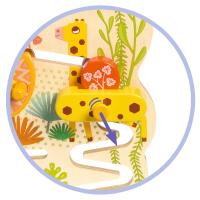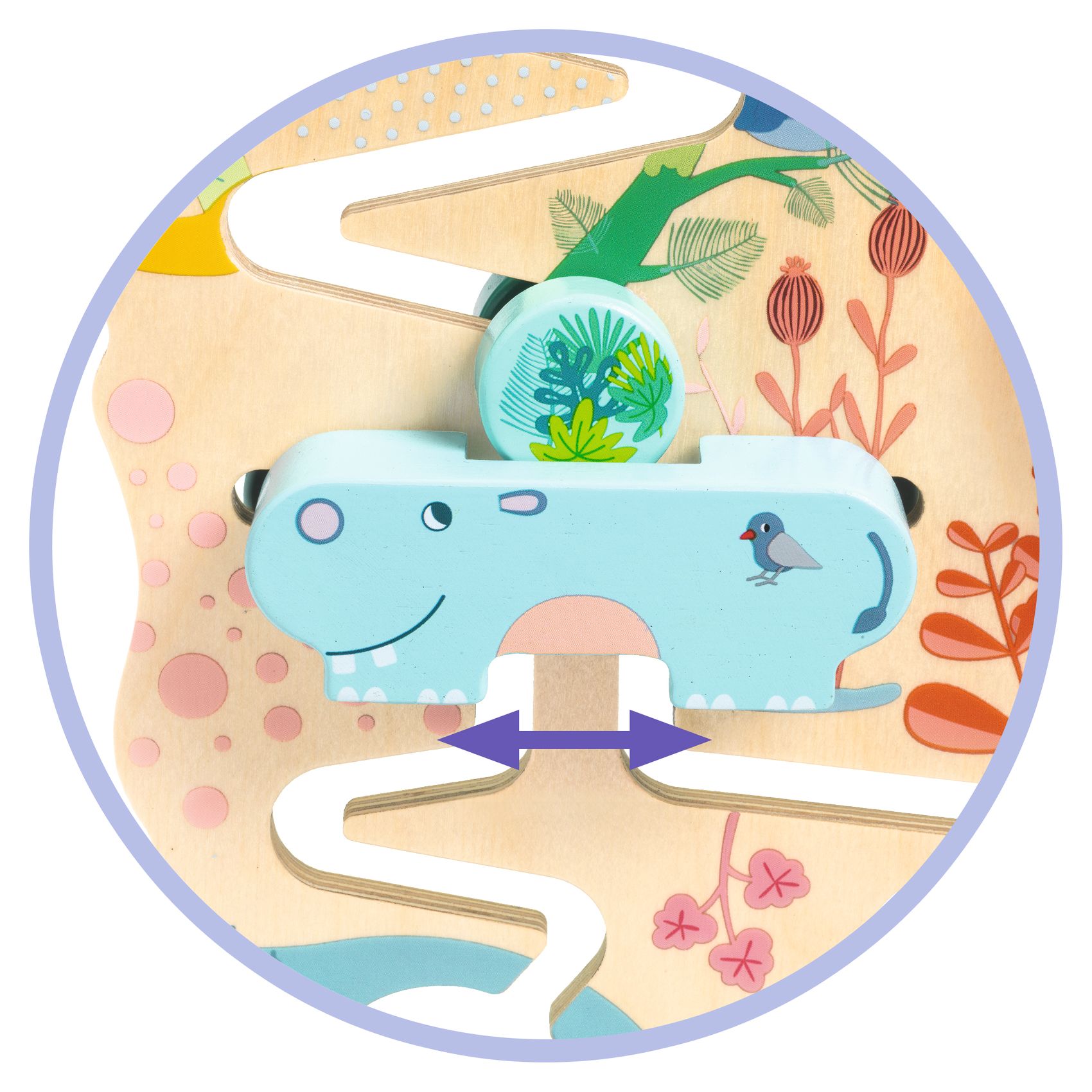 Ein Wasserfall mit Pucks aus Holz für Kinder ab 18 Monaten. Das Kind setzt die Pucks in die ?Eingänge? (3 Öffnungen) oberhalb des Wasserfalls und lässt sie nach unten gleiten. Auf halber Strecke halten 3 Tiere die Pucks fest. Um sie zu befreien, dreht das Kind den Löwen, zieht an der Giraffe oder verschiebt das Flusspferd, damit dieses verrückte Wettrennen endet.