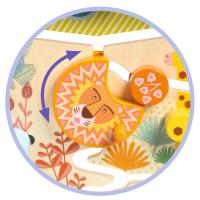 3 Mechanismen zum Betätigen: den Löwen drehen, an der Giraffe ziehen oder das Flusspferd verschieben, damit dieses verrückte Wettrennen endet.
