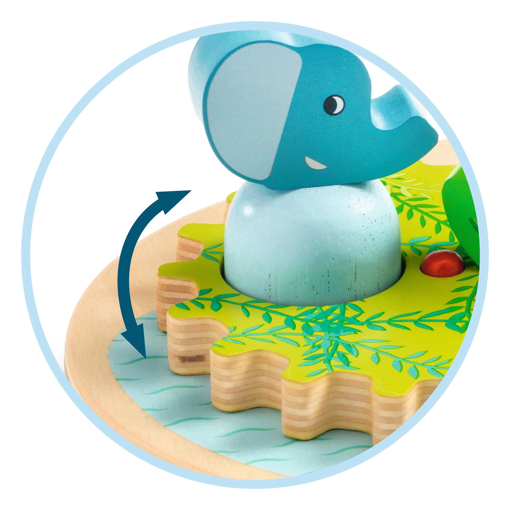 Das Zahnrad links lässt sich umdrehen. Auf einer Seite Steckplätze für die Tiere, auf der anderen die Spirale und ihr faszinierender Effekt, wenn sie sich dreht.