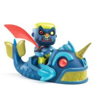 Figur mit beweglichen Armen und Kopf, die mit einem Zubehörteil und einem Monsterboot geliefert wird.