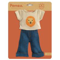 Es besteht aus einer Hose aus Jeansstoff mit breitem Umschlag und einem kurzärmeligen, elfenbeinfarbenen Jersey-T-Shirt mit einem wunderschönen Löwen-Print.
