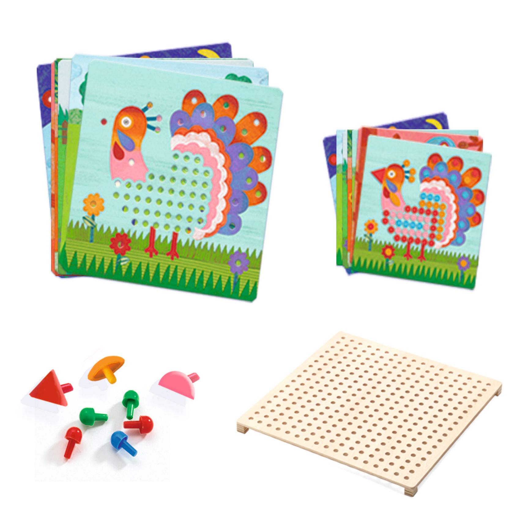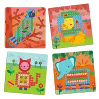 Ganz besondere Bilder entstehen mit dem Steck-Mosaik Mosaico Rigolo. Auf dem praktischen Holzbrett wird eine der 8 Tiermotivkarten aus Pappe befestigt und mit bunten Steckern in verschiedenen Formen vervollständigt. Die Kinder können sich beim Stecken an der farbigen Vorlage orientieren. Das erfordert von Kindern ab 3 Jahren Geschicklichkeit und Konzentration.