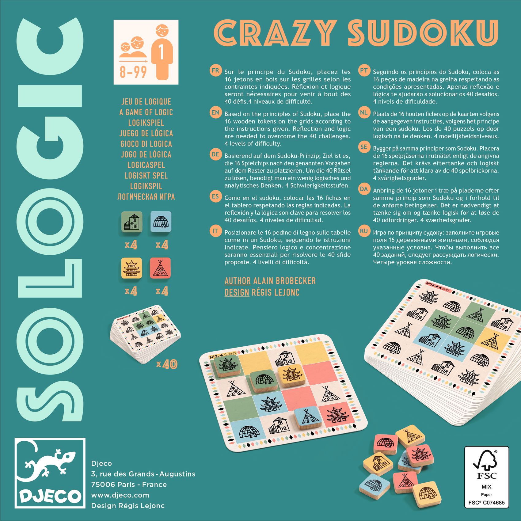 40 Aufgabenkarte und 16 Holzfiguren. Spielregeln in 10 Sprachen mit Lösungen am Ende der Spielanleitung.