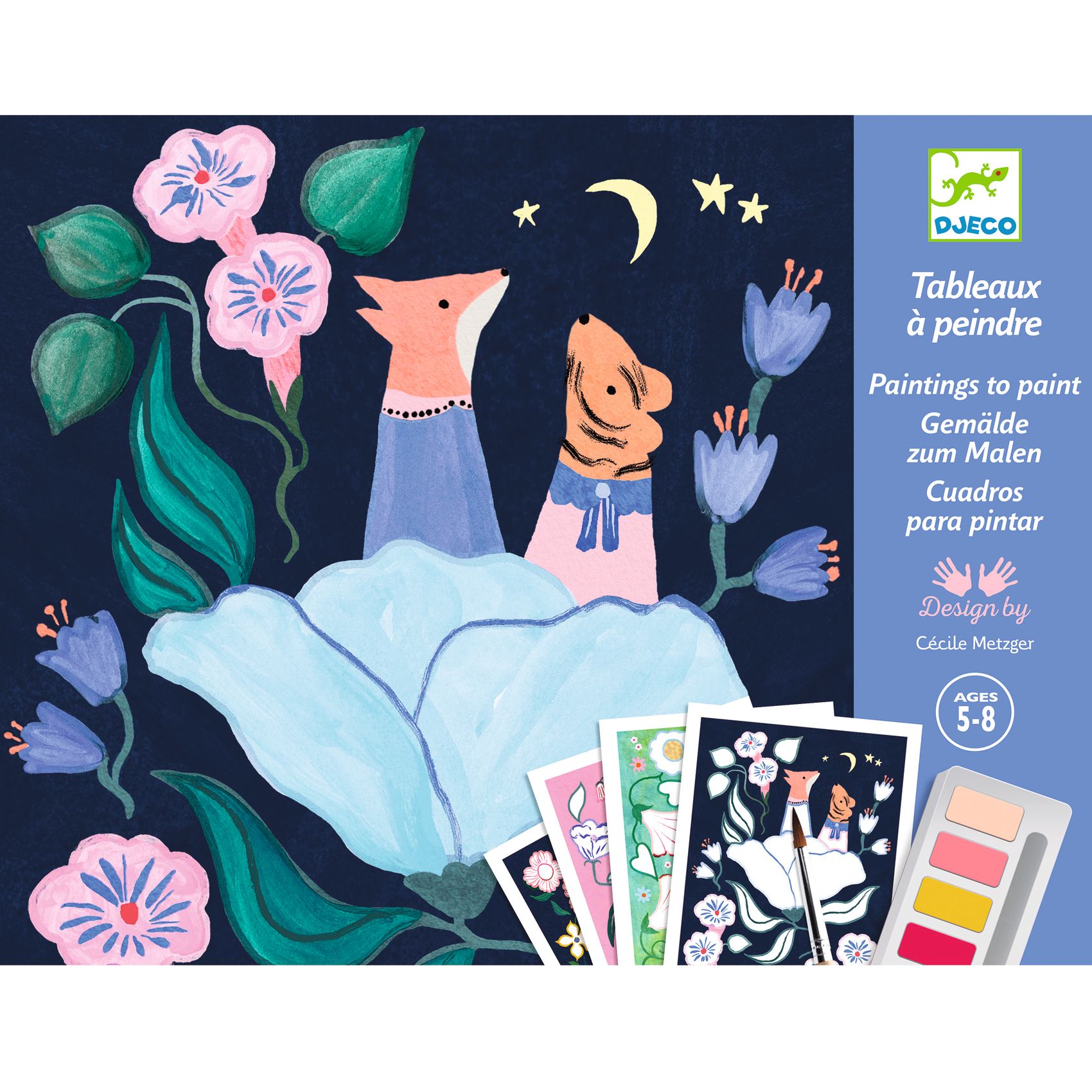 4 Bilder zum Ausmalen (21 cm x 28 cm), 4 farbige Rahmen, 1 authentische Palette aus Kunststoff mit 10 Farbnäpfen, 1 Pinsel.