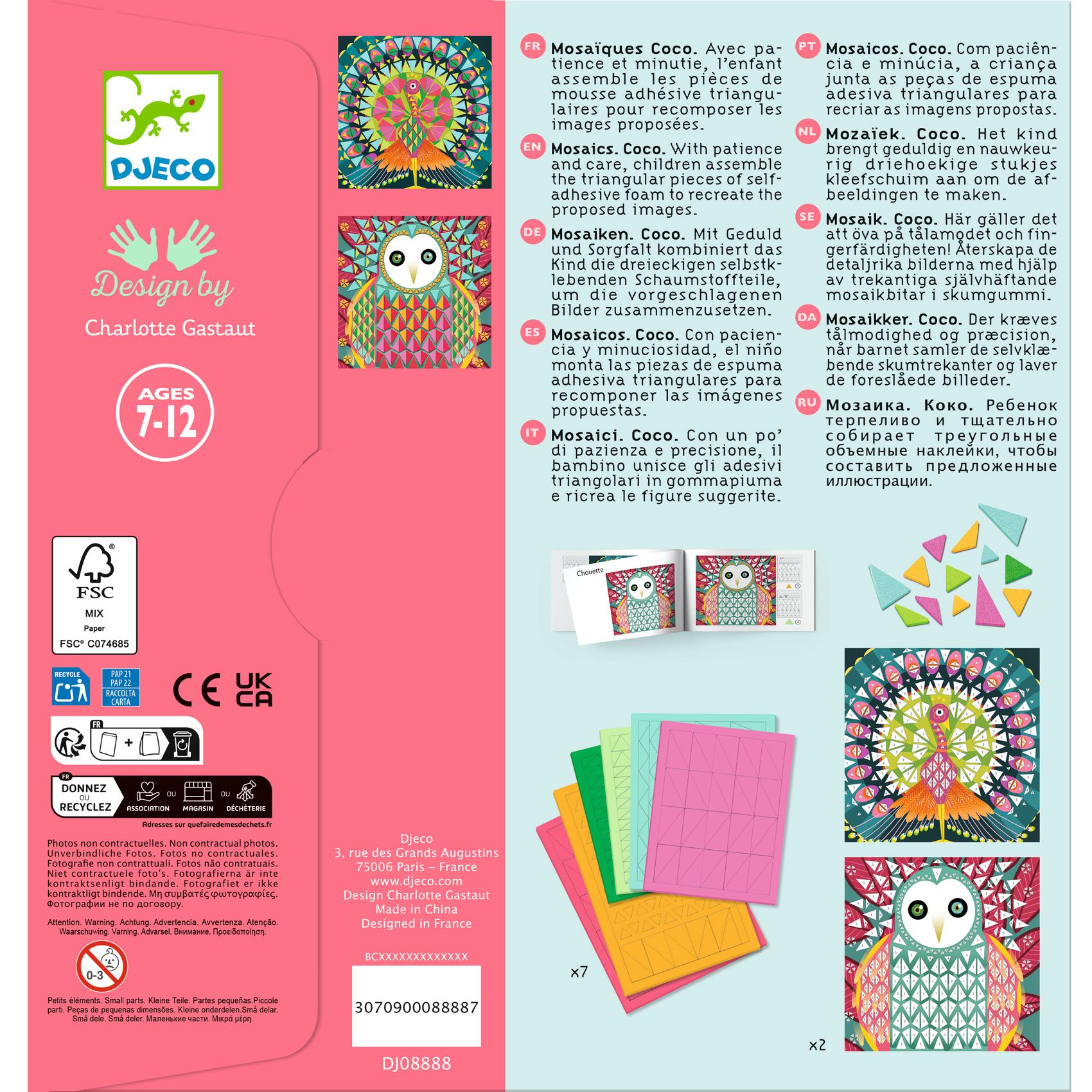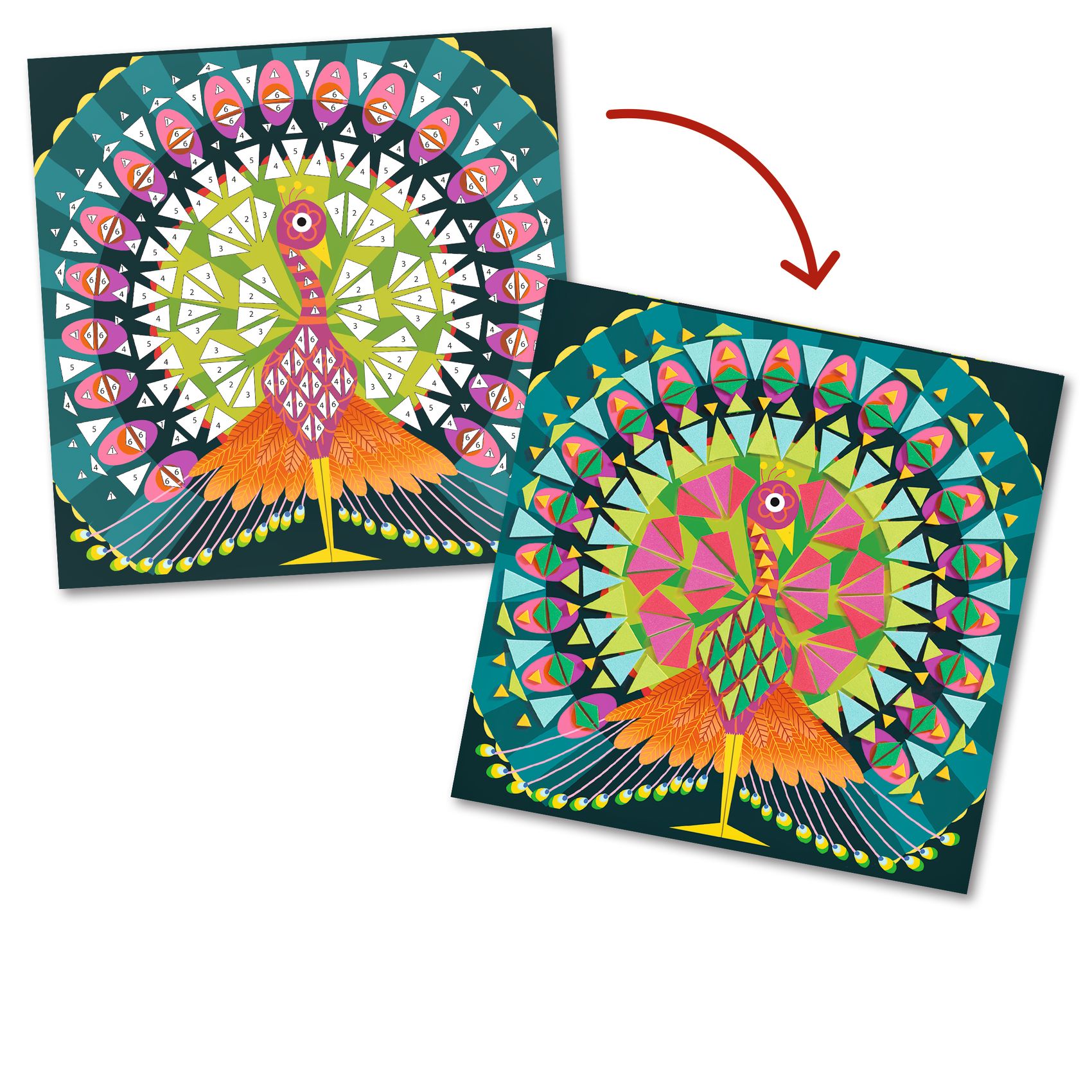 2 illustrierte Karten (21 x 21 cm), 1 Auswahl an dreieckigen Stickern aus Schaumstoff (6 Formen, 6 Farben), 1 bunte Schritt-für-Schritt-Anleitung.