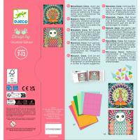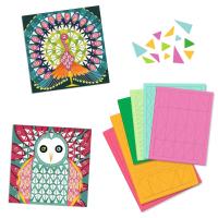 Eine Collageaktivität für die originelle Mosaiktechnik, mit dem Kinder mit dreieckigen Teilen arbeiten können. Das Kind befolgt die Anleitung Schritt für Schritt, klebt die Dreiecke aus selbstklebendem Schaumstoff ganz genau auf die Vorlage und erstellt so das Federkleid des Pfaus Tigers oder der Eule.