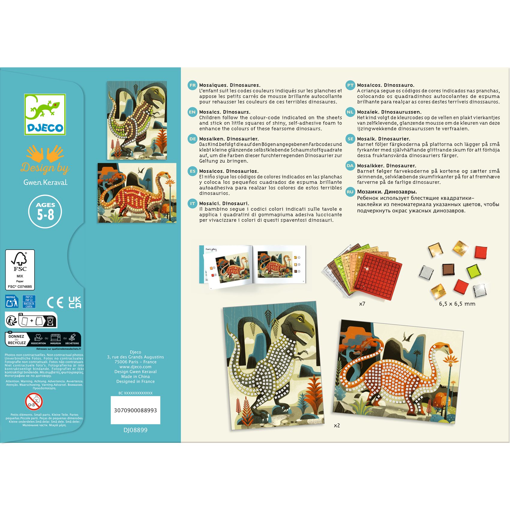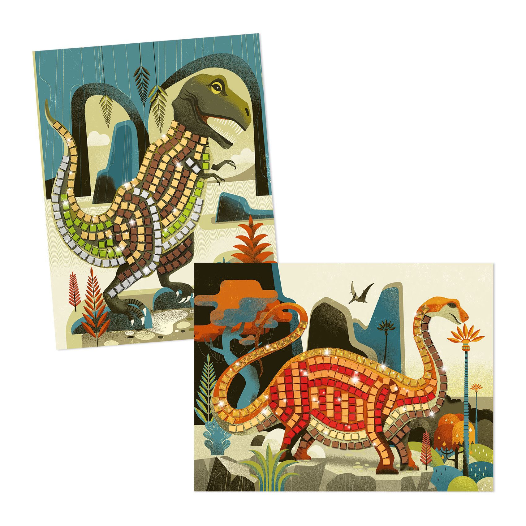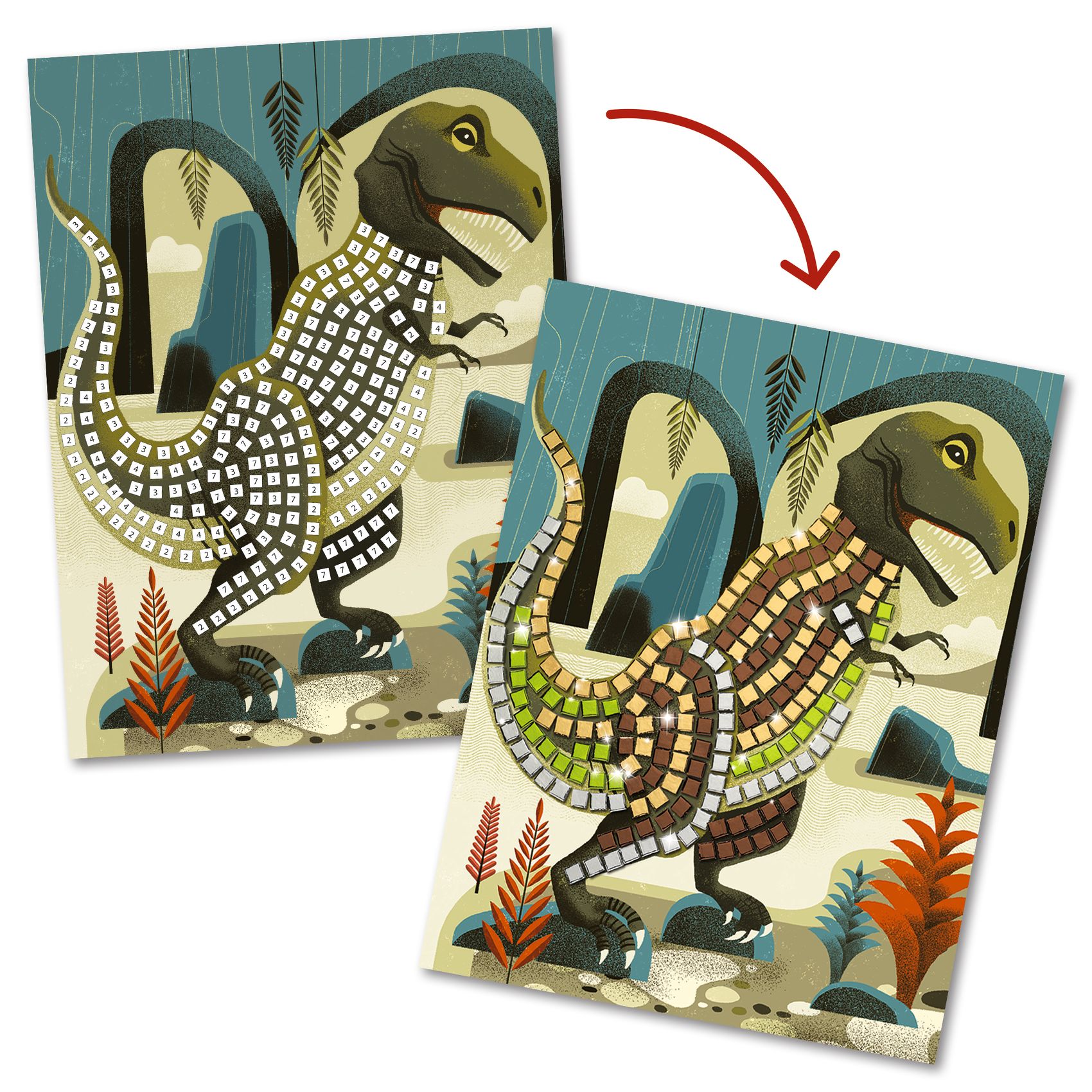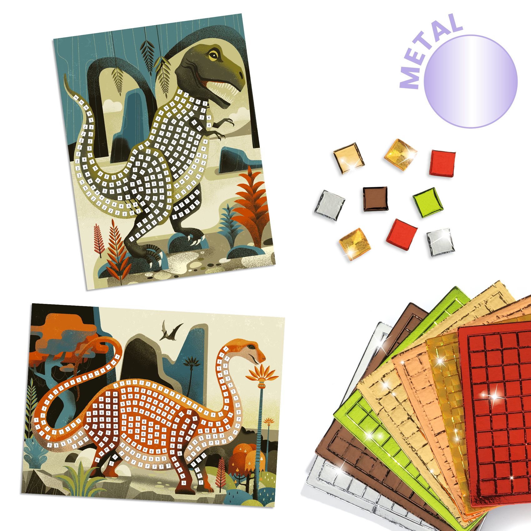 Eine Collage-Aktivität zur Erstellung von Mosaikbildern. Um den Dinosauriern Leben einzuhauchen, vervollständigt das Kind die Bilder mit den kleinen Quadraten aus selbst haftendem Schaumstoff mit Metallic-Effekt und befolgt dabei die Anweisungen der Schritt-für Schritt-Anleitung.