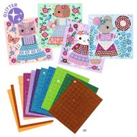 4 illustrierte Karten, 12 Bögen mit selbstklebenden Quadraten aus Moosgummi mit metallisch glänzendem Glitter, 1 Schritt-für-Schritt-Anleitung in Farbe.