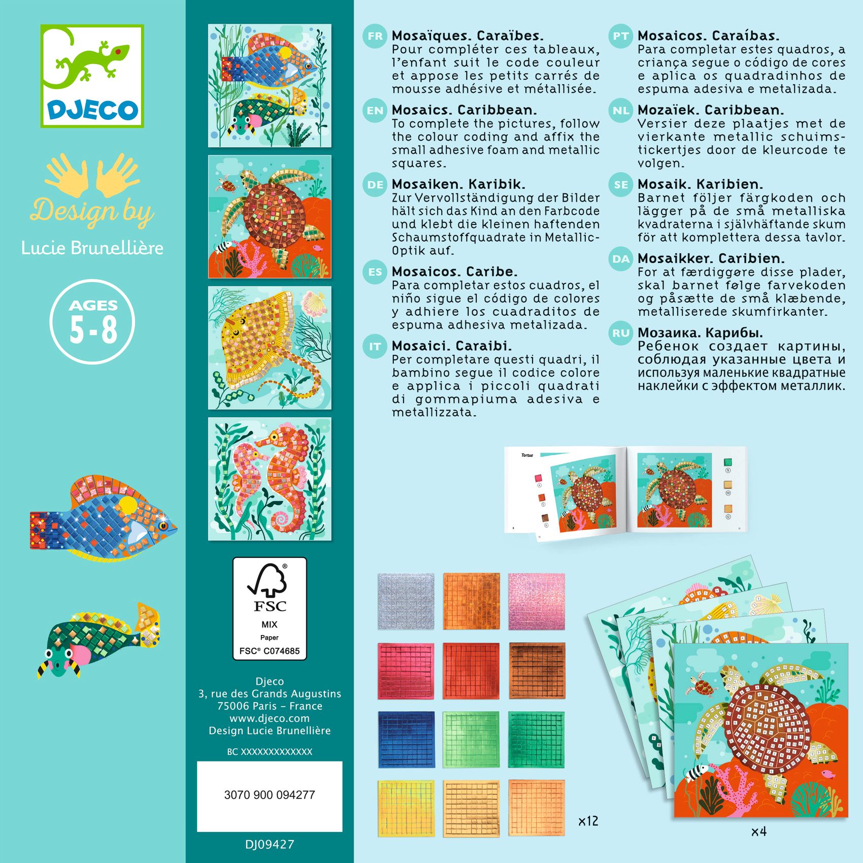 4 illustrierte Karten, 12 Bogen mit selbstklebenden Metallic-Mosaiksteinen aus Schaumstoff, 1 Schritt-für-Schritt-Anleitung in Farbe.