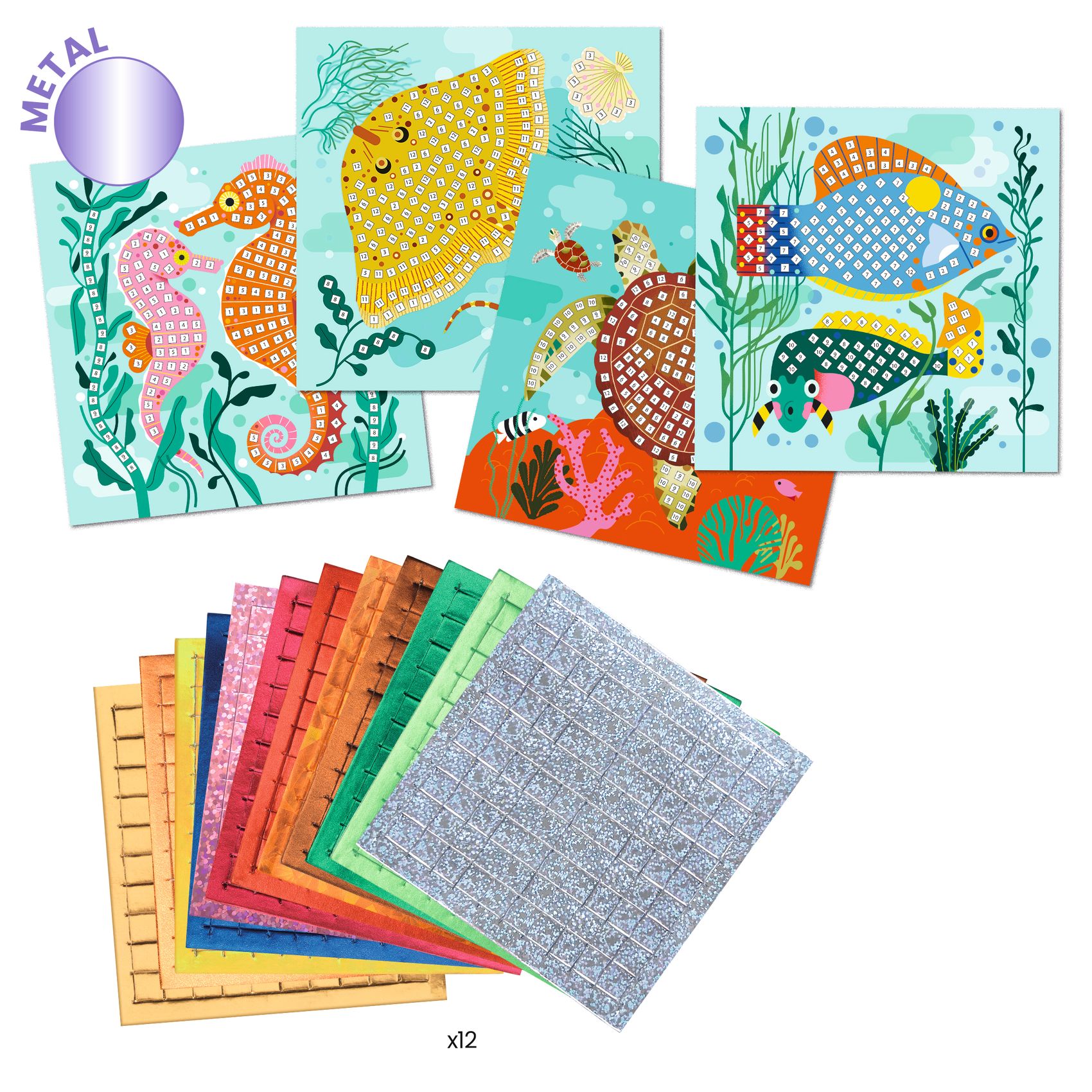 Ein Mosaik-Einsteigerset. 4 Bogen zum Dekorieren mit kleinen Metallic-Mosaiksteinen aus Schaumstoff. Das Kind sucht die Zahlen und klebt die entsprechenden Teile dann auf den dafür vorgesehenen Platz. Es entstehen wundervolle Bilder, und die Unterwasserwelt erstrahlt in schillernden Farben.