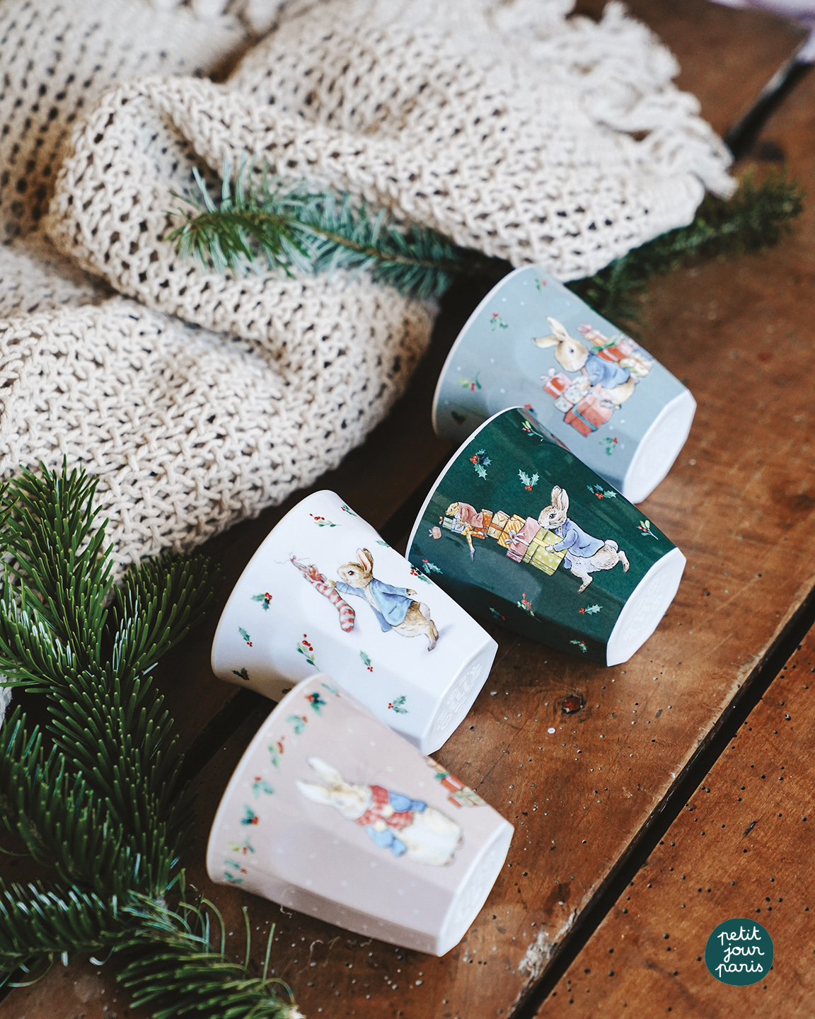 Ein festliches Set aus vier facettierten Bechern mit Peter Hase in entzückenden Weihnachtsszenen : ein leuchtender Baum, verpackte Geschenke, ein Schneemann und gemütliche Momente am Fenster.