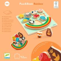 Puzz & Boom ist ein einfach zu bildendes Holzpuzzle und zugleich ein Gleichgewichtsspiel. Die Relieftiere stehen und können aufeinandergestapelt werden, um auf dem ?Regenbogen?-Sockel eine Pyramide zu bilden.