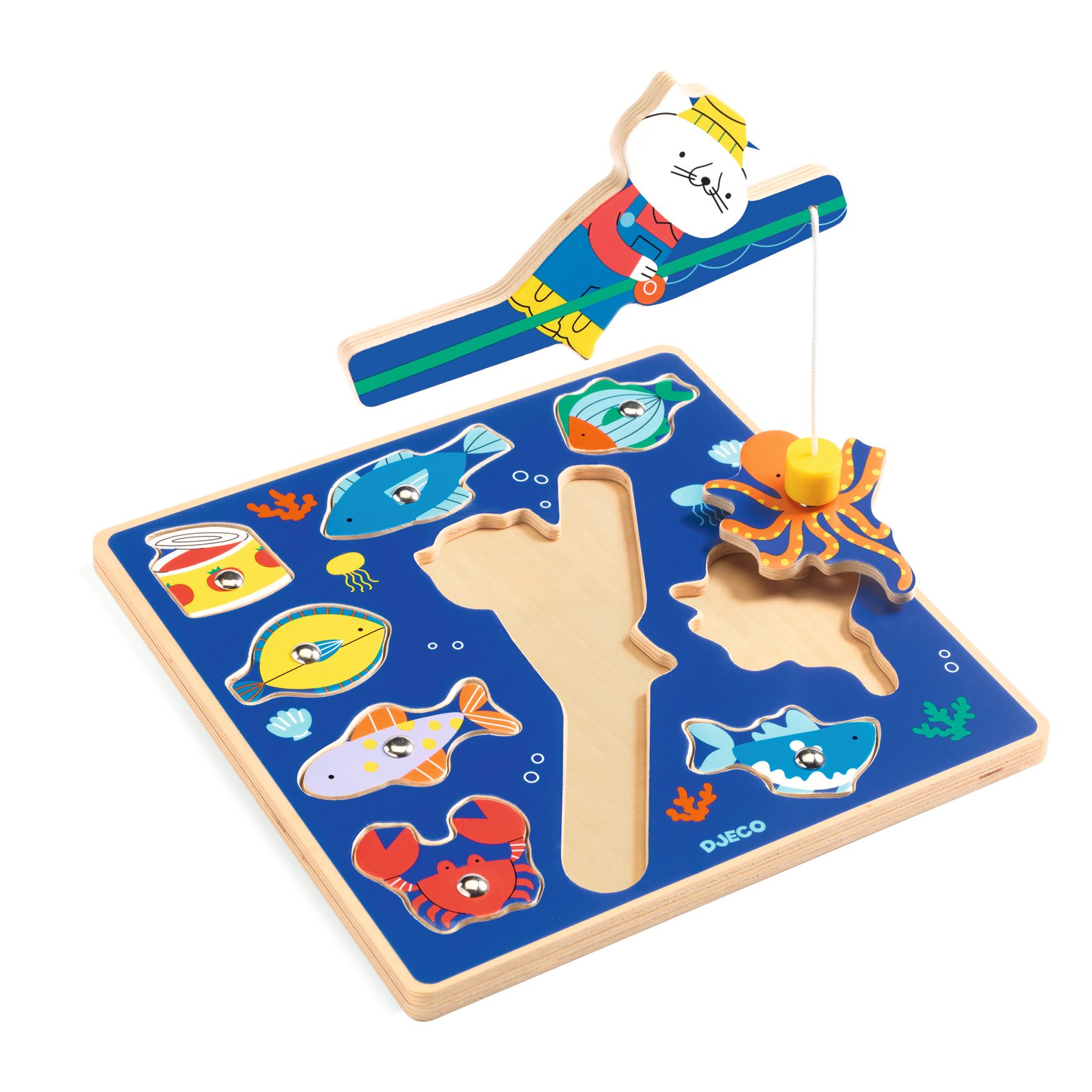 Puzz & Fish sind 2 Spiele in einem: ein Holzpuzzle und ein Angelspiel. Die von der Katze gehaltene Angelrute ist magnetisch. Das Kind fängt die Fische mithilfe der angelnden Katze, dann ersetzt es die Elemente an der jeweiligen Stelle auf dem Rahmen.