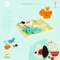 Puzz & Play ist ein Holzpuzzle, das sich einfach zusammensetzen lässt. Die beiden Teile jedes Ensembles fügen sich zu Freundespaaren zusammen. Das Kind kann anhand der zusammenpassenden Farben überprüfen, ob es das richtige Duo gefunden hat.