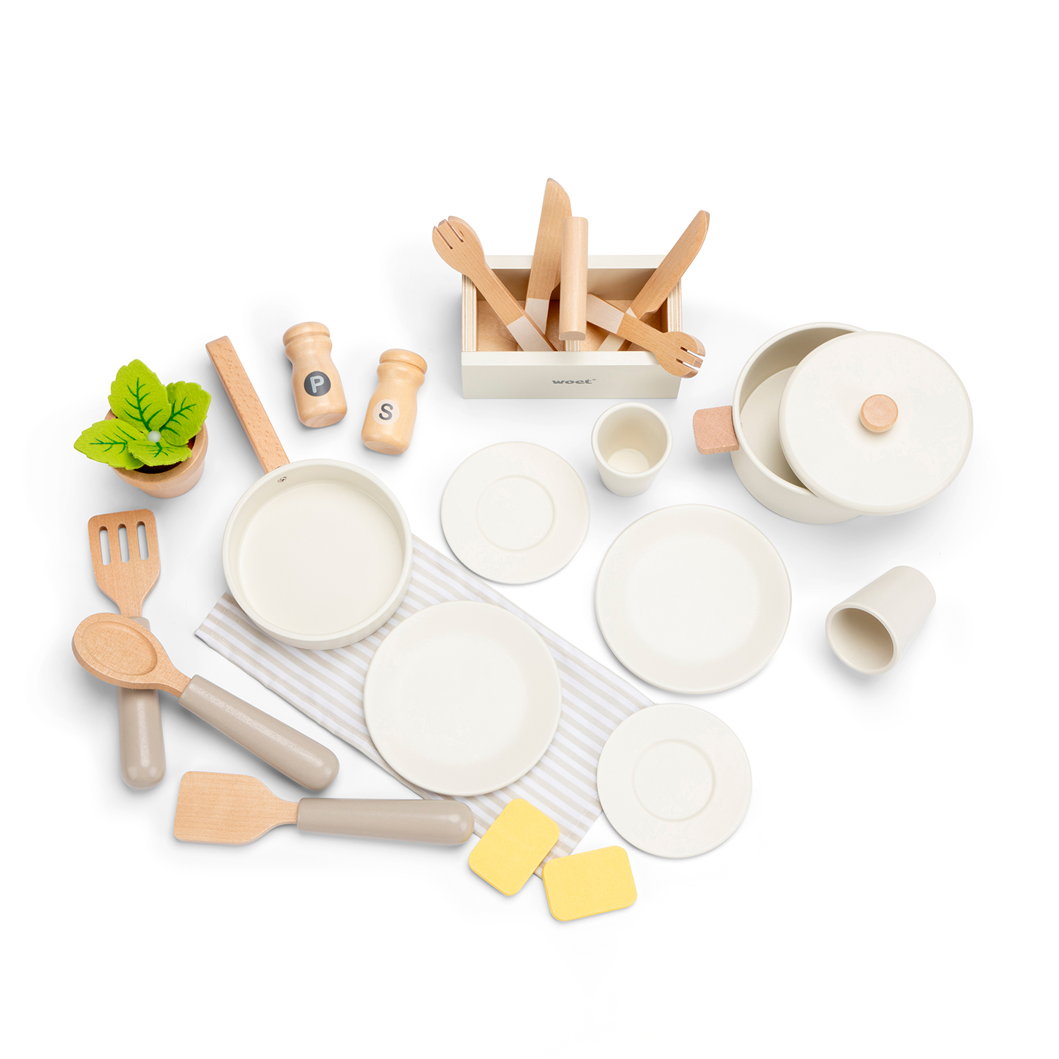 ? Inhalt: Kücheneinheit mit Herd, Backofen, Geschirrspüler und Spüle sowie über 20 Holzaccessoires (Töpfe, Tassen, Teller, Besteck, Salz- und Pfefferstreuer und mehr)
