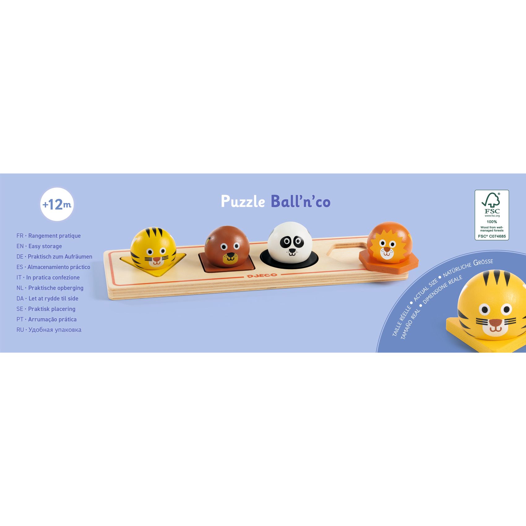 Ball?n?Co ist ein leicht zusammensetzbares Holzpuzzle zum Thema wilde Tiere: Die Puzzleteile mit den aufgesetzten, runden Tierköpfen erleichtern das Greifen für kleine Kinderhände.