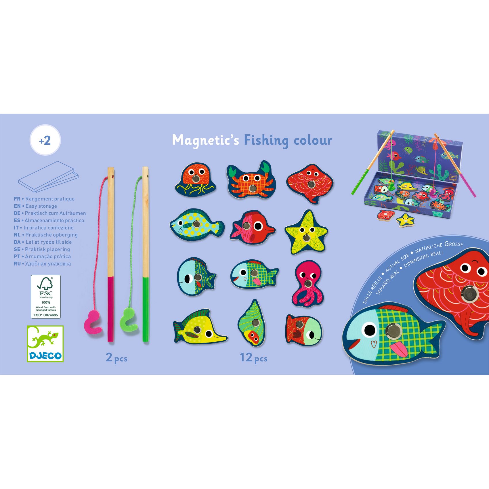 Bereit für einen Angelausflug? Meerestiere aus Holz, 2 Angelruten und eine hübsche Schachtel, die den Meeresboden darstellt. Das Kind fängt die magnetischen Holzteile mit der Angel. Der Angelausflug kann beginnen! Für kleine Fischer ab 2 Jahren.