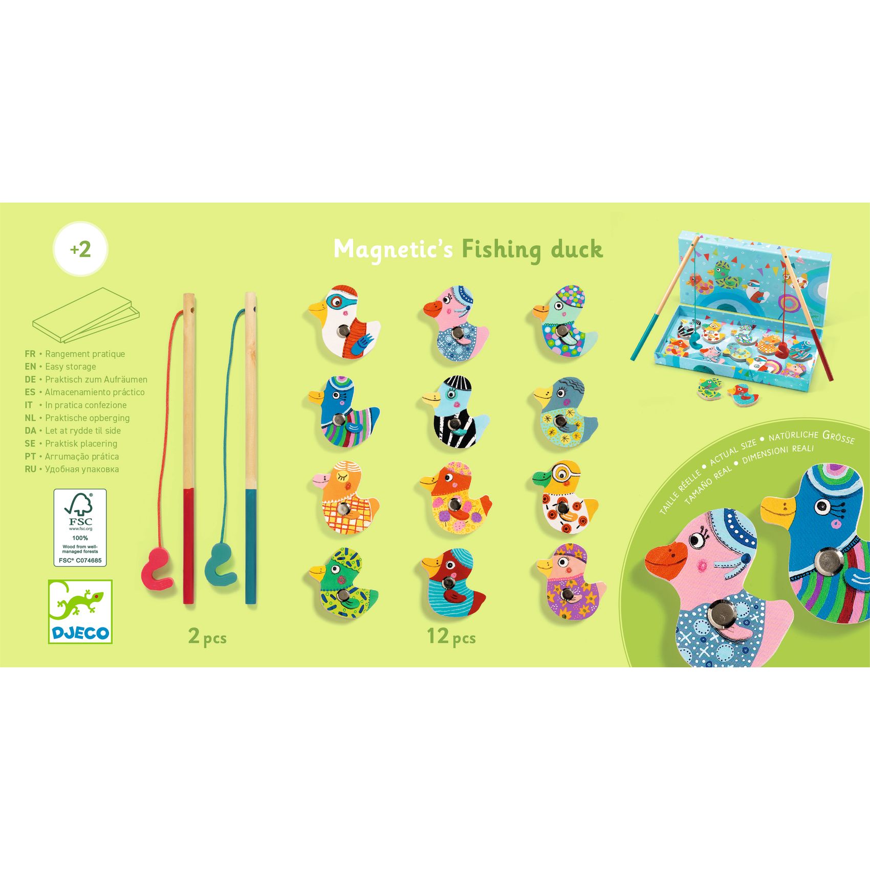 Bereit für einen Angelausflug? Enten aus Holz, 2 Angelruten und eine hübsche Schachtel, die das Jahrmarktbecken darstellt. Das Kind fängt die magnetischen Holzenten mit der Angel. Der Angelausflug kann beginnen! Für kleine Fischer ab 2 Jahren.