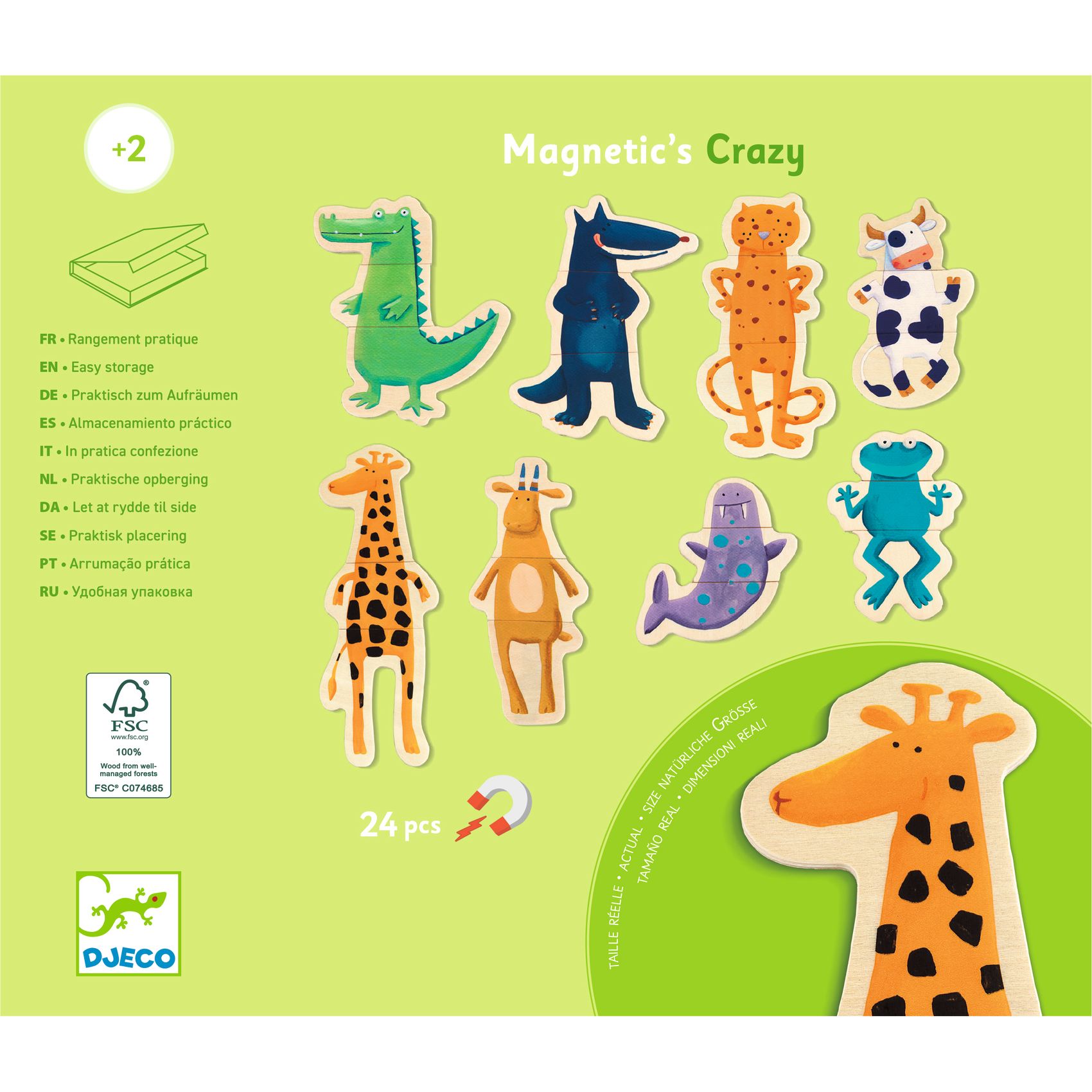 Eine Box mit 24 magnetischen Holzteilen, um Tiere zusammenzusetzen oder sich noch komischere Wesen auszudenken. Das Kind hilft dem Krokodil, seinen Körper und seine Beine wiederzufinden!