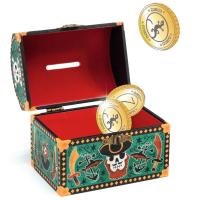 Schöne Spardose mit einem Piratenmotiv. Schönes Deko-Objekt mit einem Schlitz auf der Oberseite, um die Geldstücke eines nach dem anderen hineinzuschieben. Die Spardose hat ein Vorhängeschloss mit 2 Schlüsseln, um das gesparte Geld herausnehmen zu können.
