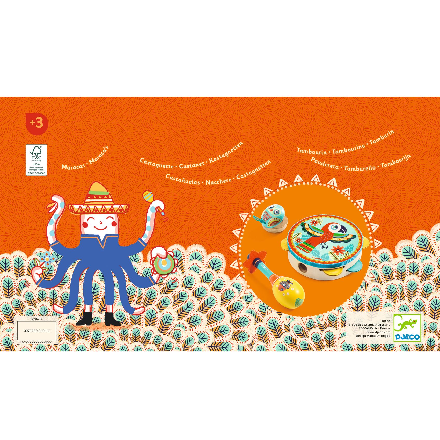 Ein tolles Set mit drei hübsch gestalteten Schlaginstrumenten: ein Tamburin, eine Rassel und eine Kastagnette. Das ideale Geschenk, um Kinder ab 3 Jahren mit Schlaginstrumenten für Musik zu begeistern!