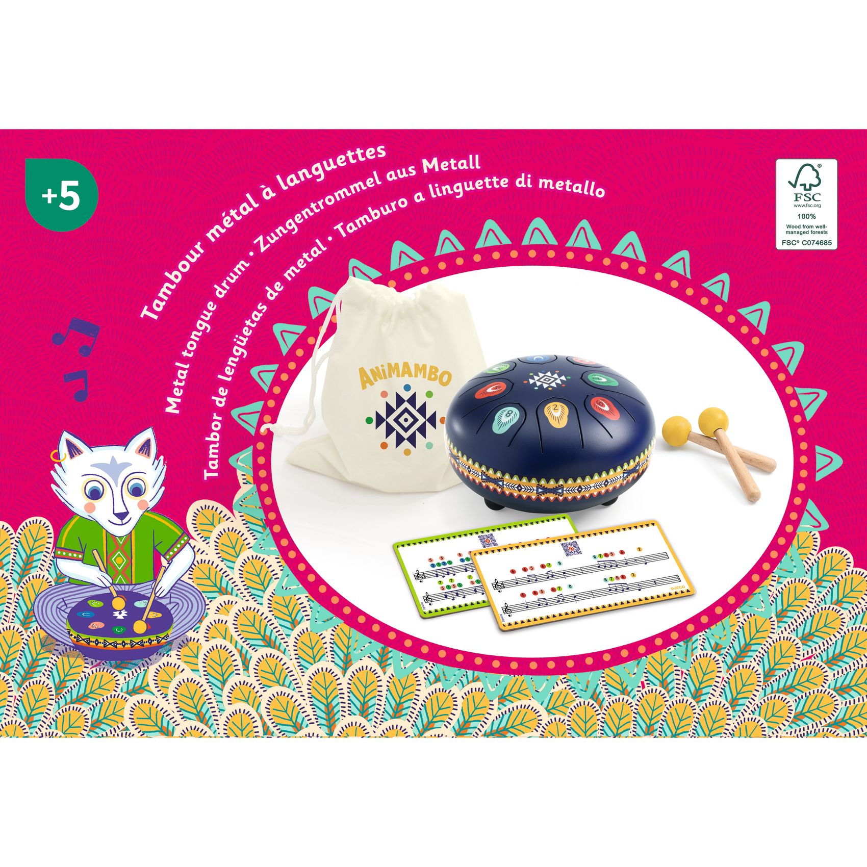 Eine wunderschöne Trommel aus raffinierte, Stahl im Indianer-Design. Ein Schlaginstrument mit 8 Laschen, die 8 Musiknoten entsprechen. Es lässt sich intuitiv und ganz einfach spielen: Das Kind muss nur mit den Stäbchen auf die Laschen schlagen und schon gibt das Instrument über Vibrationen einen sanften, entspannenden Klang ab. Perfekt für die Kreation oder zum Nachahmen von beruhigenden Melodien! Das ideale Geschenk für kleine Musiker ab 5 Jahren.